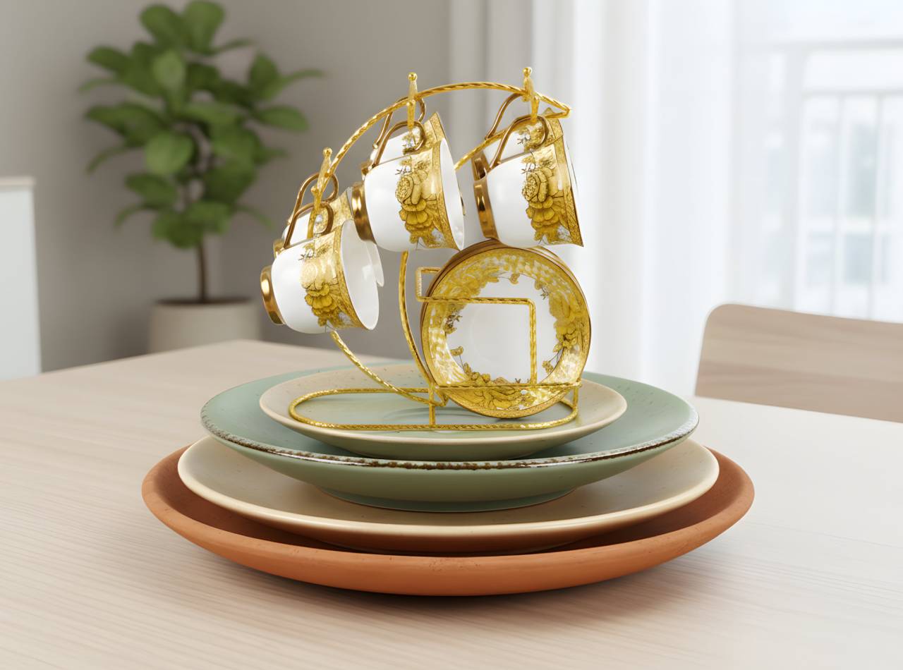 Dilengkapi dengan Rak minimalis untuk meletakkan Lepek dan juga terdapat pengait (hook) pada bagian atas Rak untuk menggantungkan Cangkir sehingga menambah estetika saat dipajang.