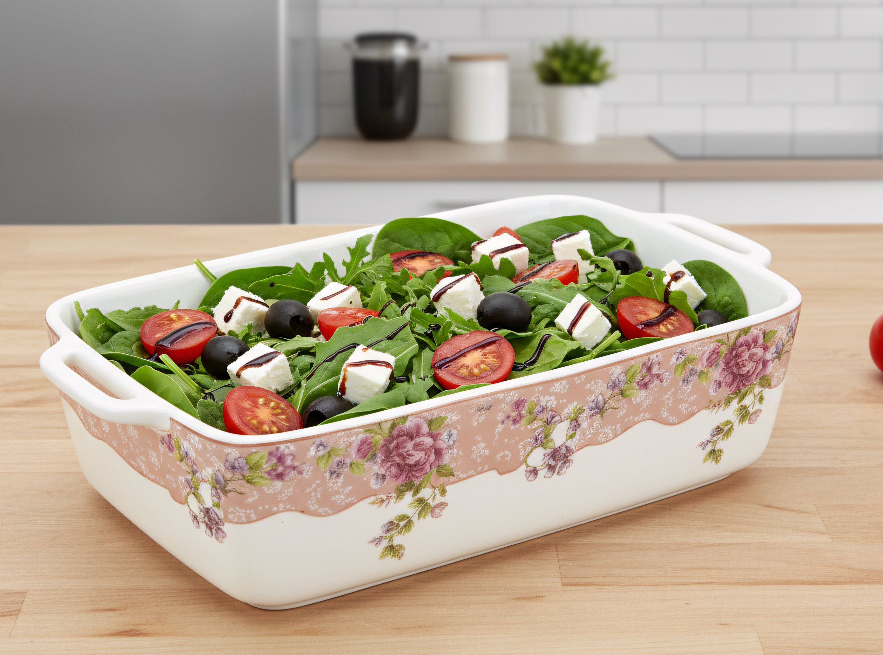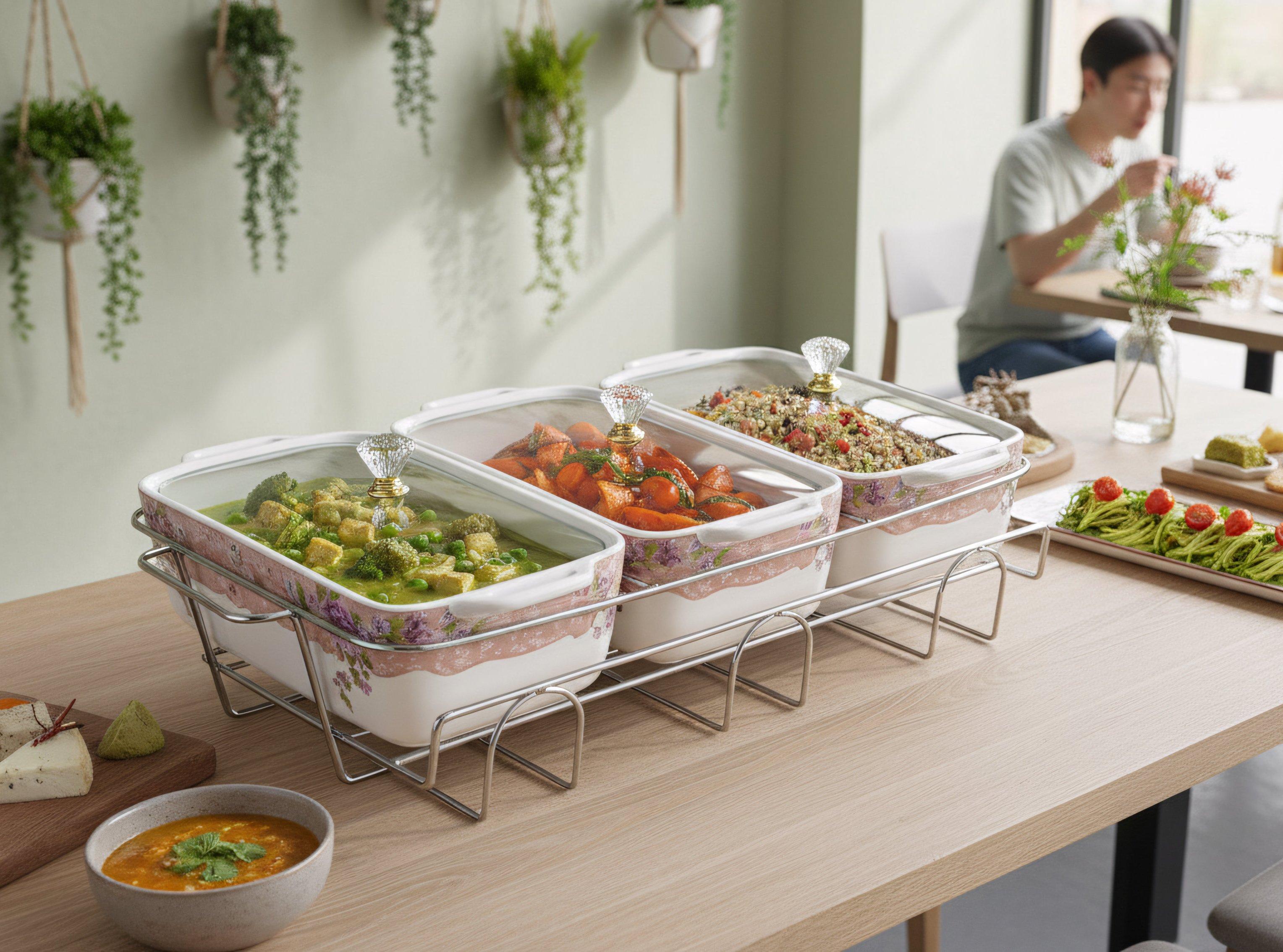Wadah saji terbuat dari bahan Porcelain berkapasitas besar (1.3L per wadah) sehingga cukup untuk menampung makanan dalam jumlah banyak.