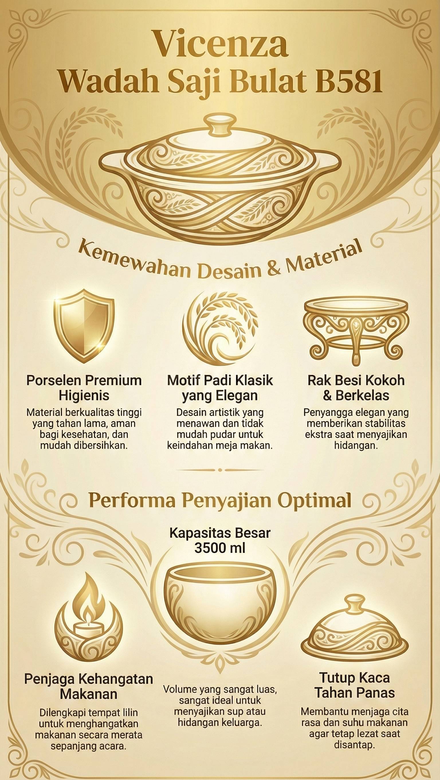 Vicenza Wadah Saji Bulat Lily B581 adalah sajian porselen premium dengan motif Lily elegan yang dirancang untuk mempercantik momen bersantap Anda. Dengan ukuran diameter 23 cm, tinggi 14 cm, dan kapasitas besar hingga 3500 ml, wadah ini cocok untuk menyajikan sup, lauk, atau berbagai hidangan favorit keluarga.