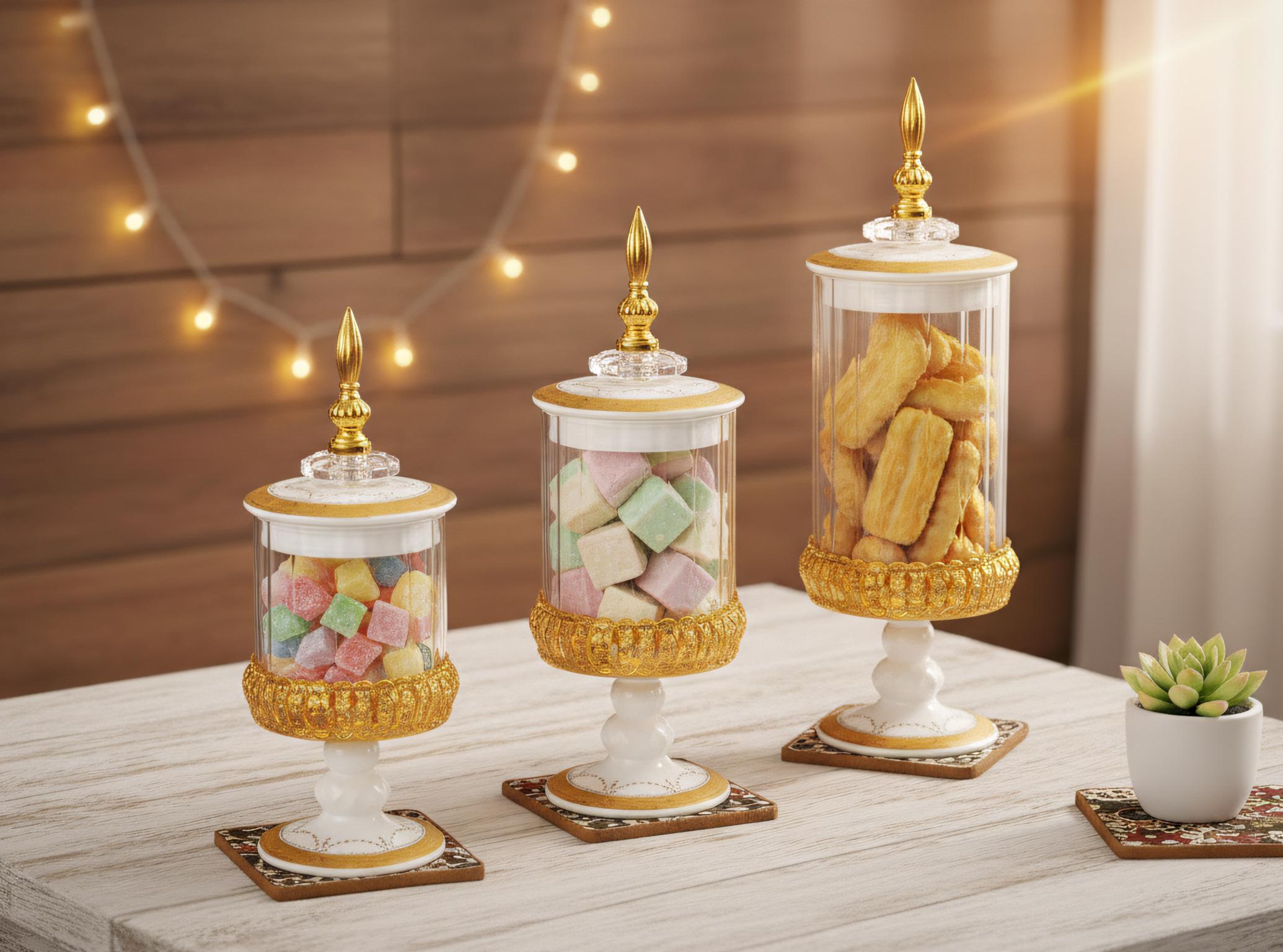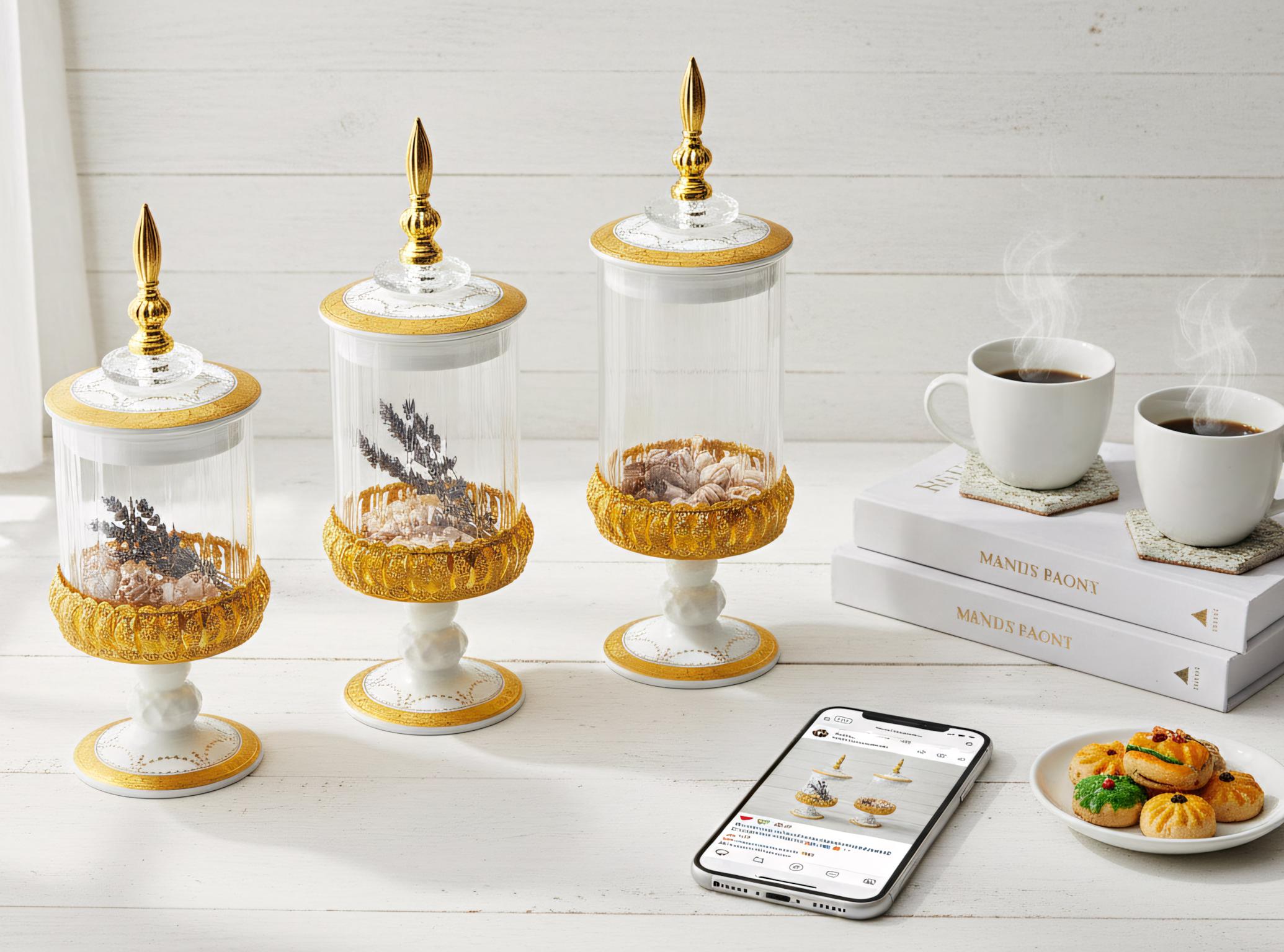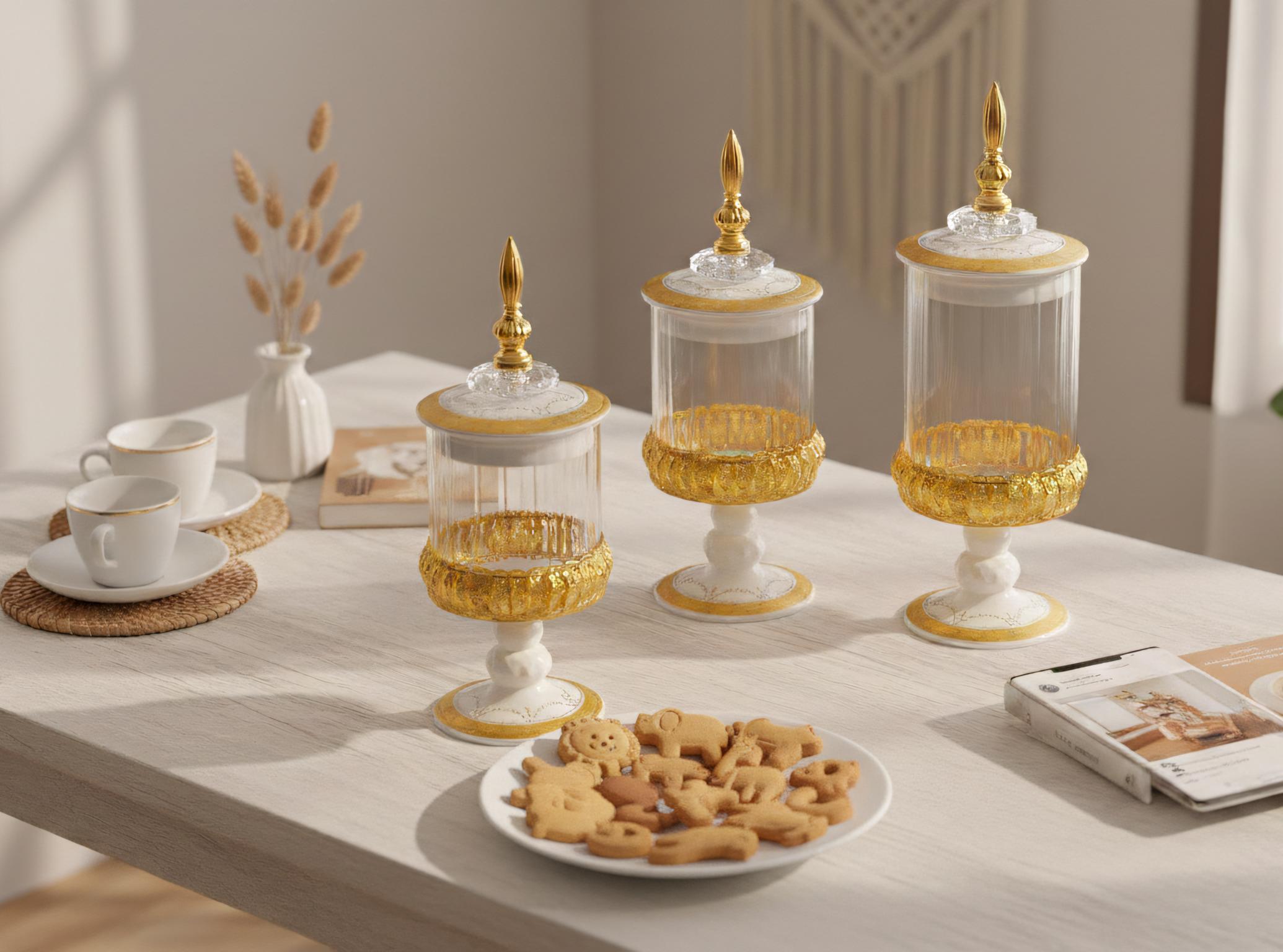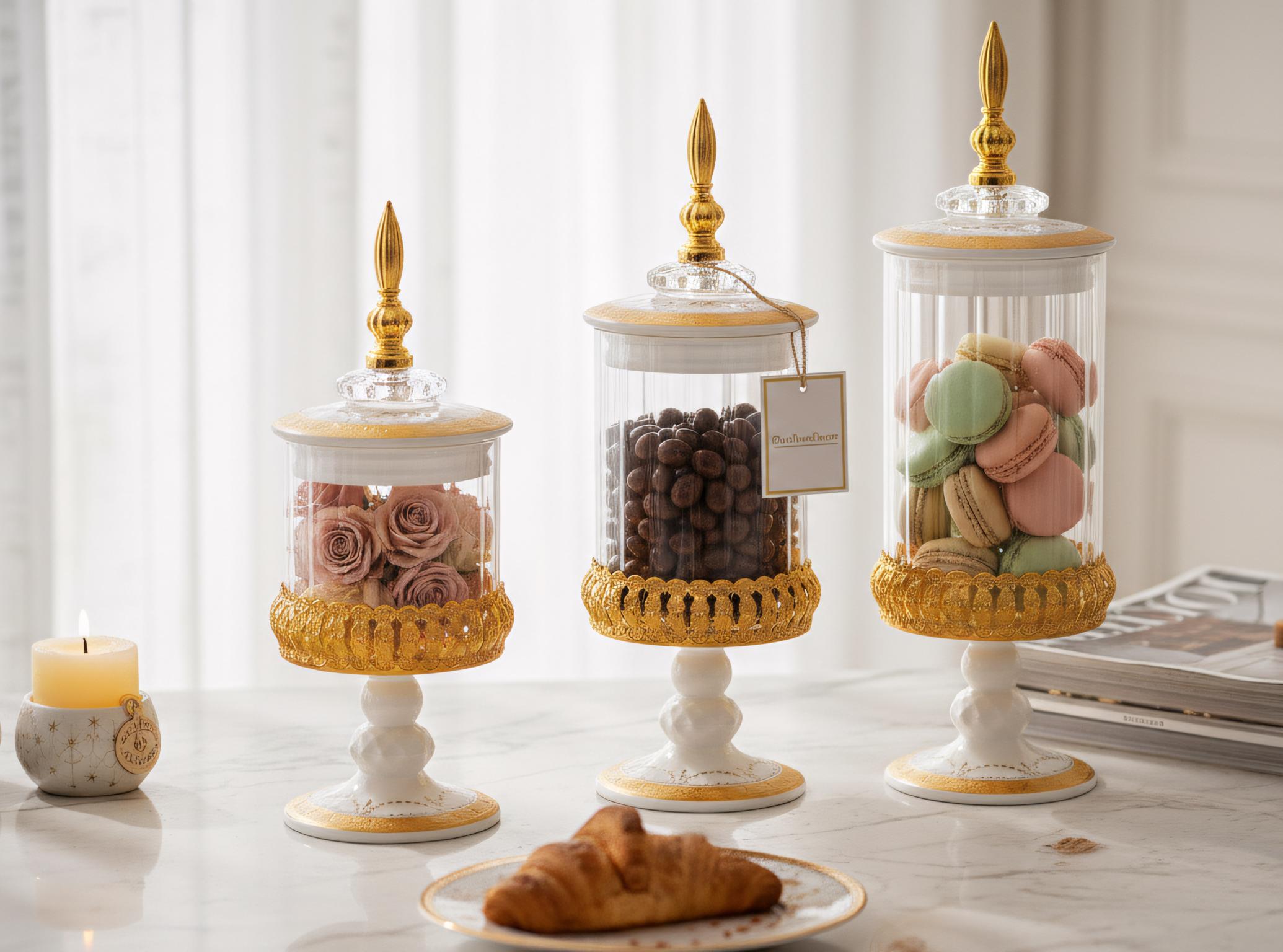 Wadah ini sangat serbaguna untuk menyimpan berbagai kudapan, mulai dari permen warna-warni, cokelat, makanan kering, hingga kue-kue kering favorit keluarga. Setiap unit dalam set isi tiga ini dihiasi dengan motif khas Vicenza yang mewah, menjadikannya bukan sekadar wadah penyimpanan biasa, melainkan centerpiece yang mempesona untuk mempercantik meja tamu Anda.