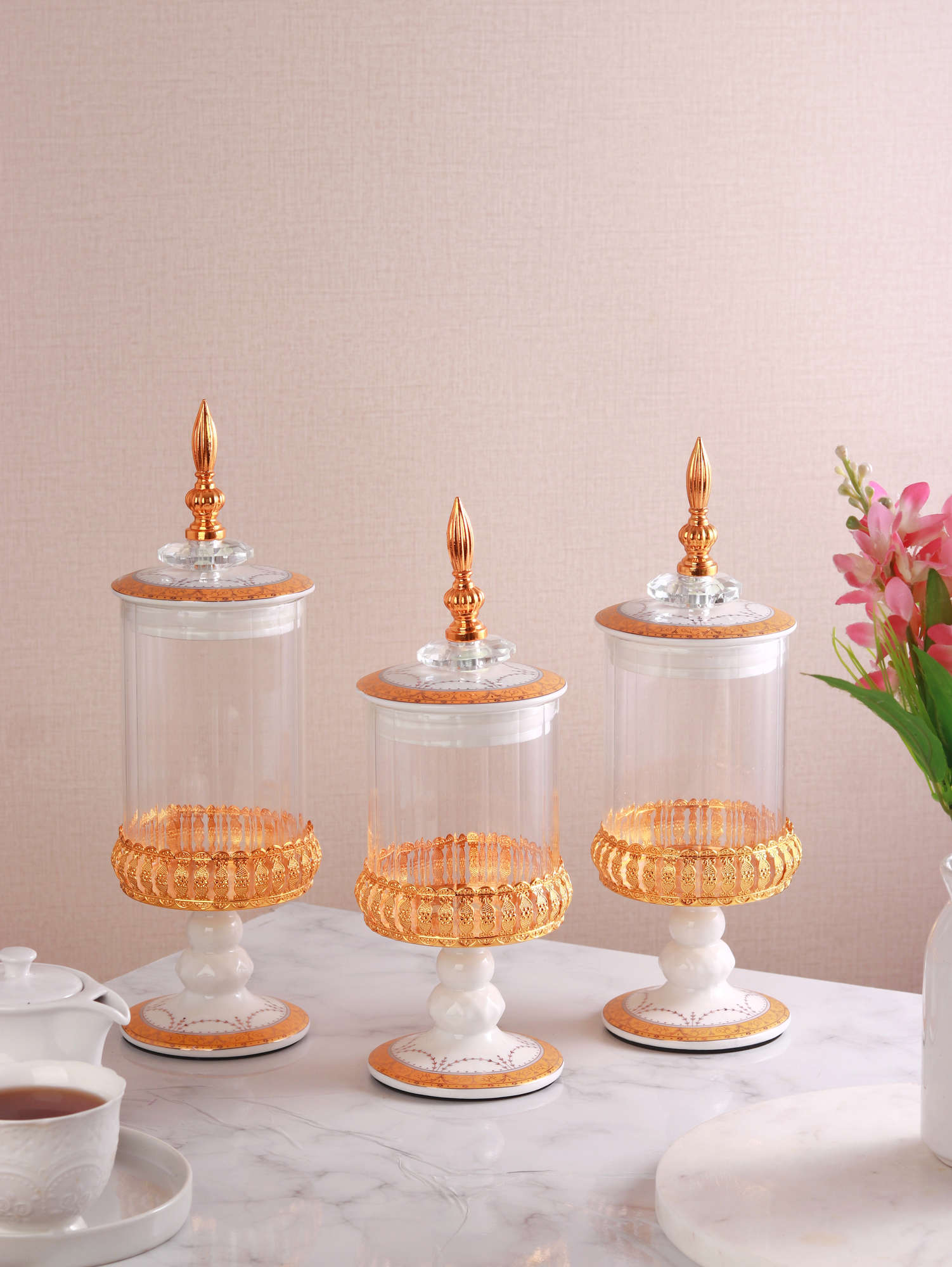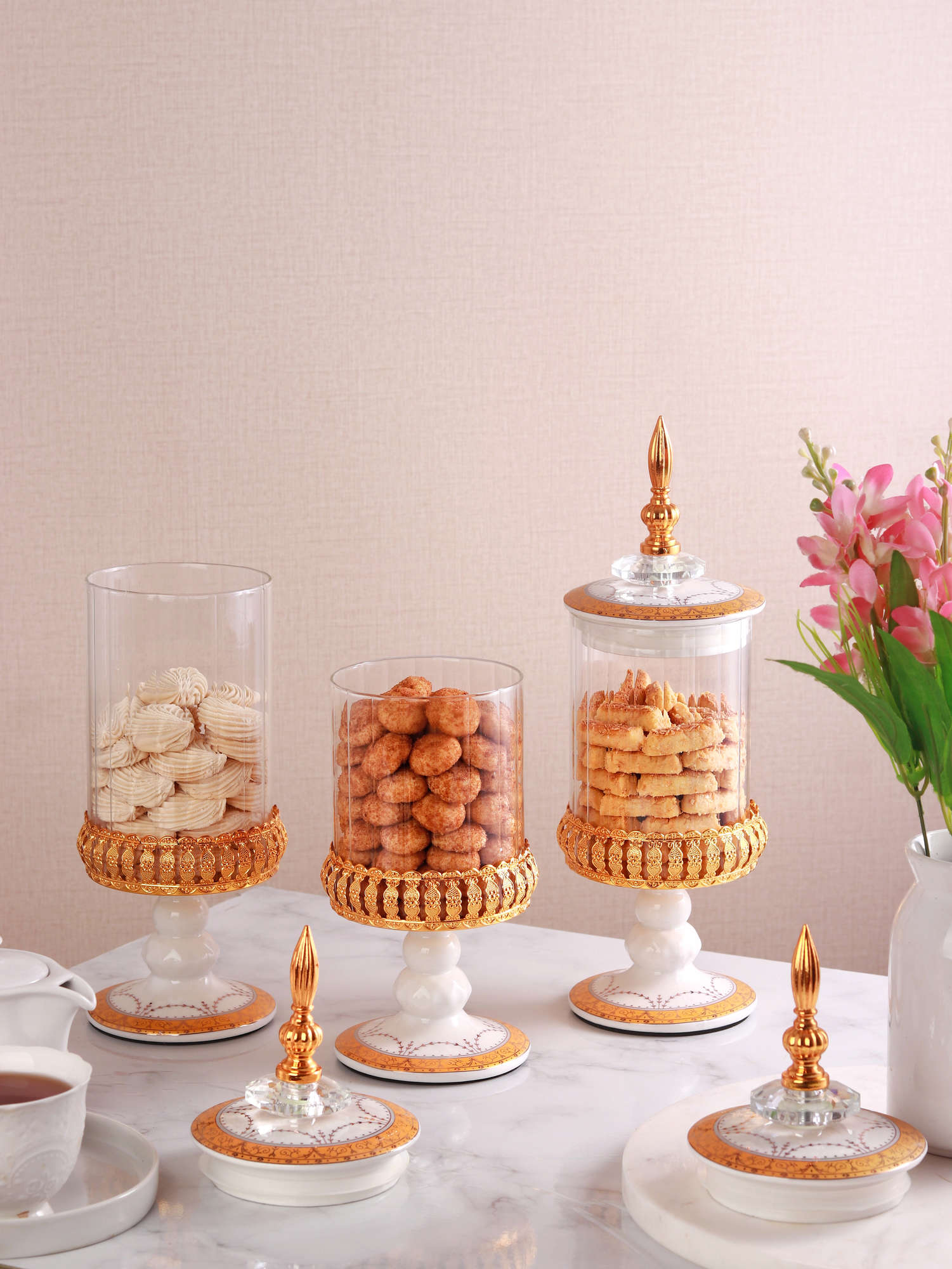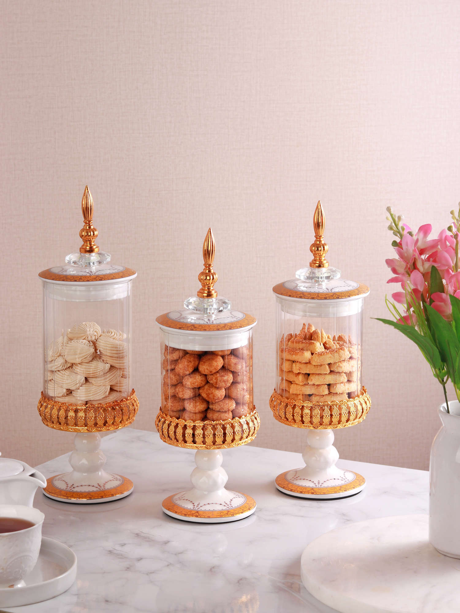 Wadah ini sangat serbaguna untuk menyimpan berbagai kudapan, mulai dari permen warna-warni, cokelat, makanan kering, hingga kue-kue kering favorit keluarga. Setiap unit dalam set isi tiga ini dihiasi dengan motif khas Vicenza yang mewah, menjadikannya bukan sekadar wadah penyimpanan biasa, melainkan centerpiece yang mempesona untuk mempercantik meja tamu Anda.