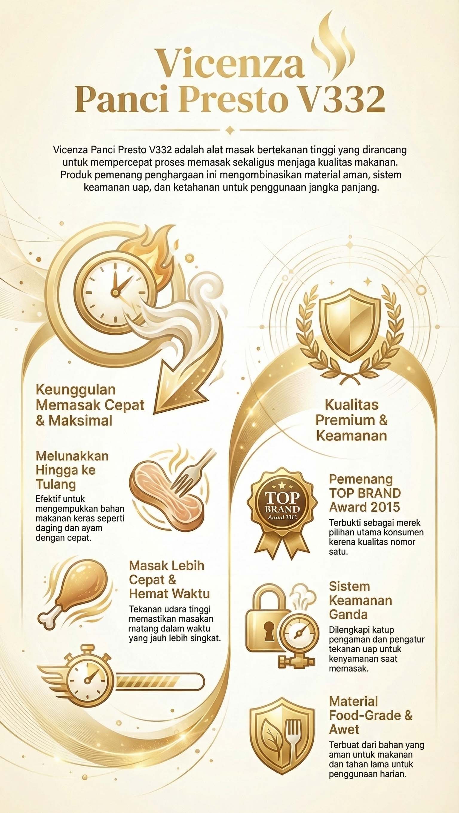 Pressure Cooker juga dapat digunakan untuk melunakkan atau mengempukkan bahan-bahan seperti daging, ayam bahkan hingga ke tulang. Tak heran jika Pressure Cooker Vicenza ini pun telah meraih TOP BRAND award di tahun 2015 karena kualitasnya yang no.1. Anda dapat menghemat waktu memasak dengan panci presto / pressure cooker ini. Karena Pressure Cooker Vicenza memiliki tekanan udara yang tinggi dan membuat masakan lebih cepat matang.
