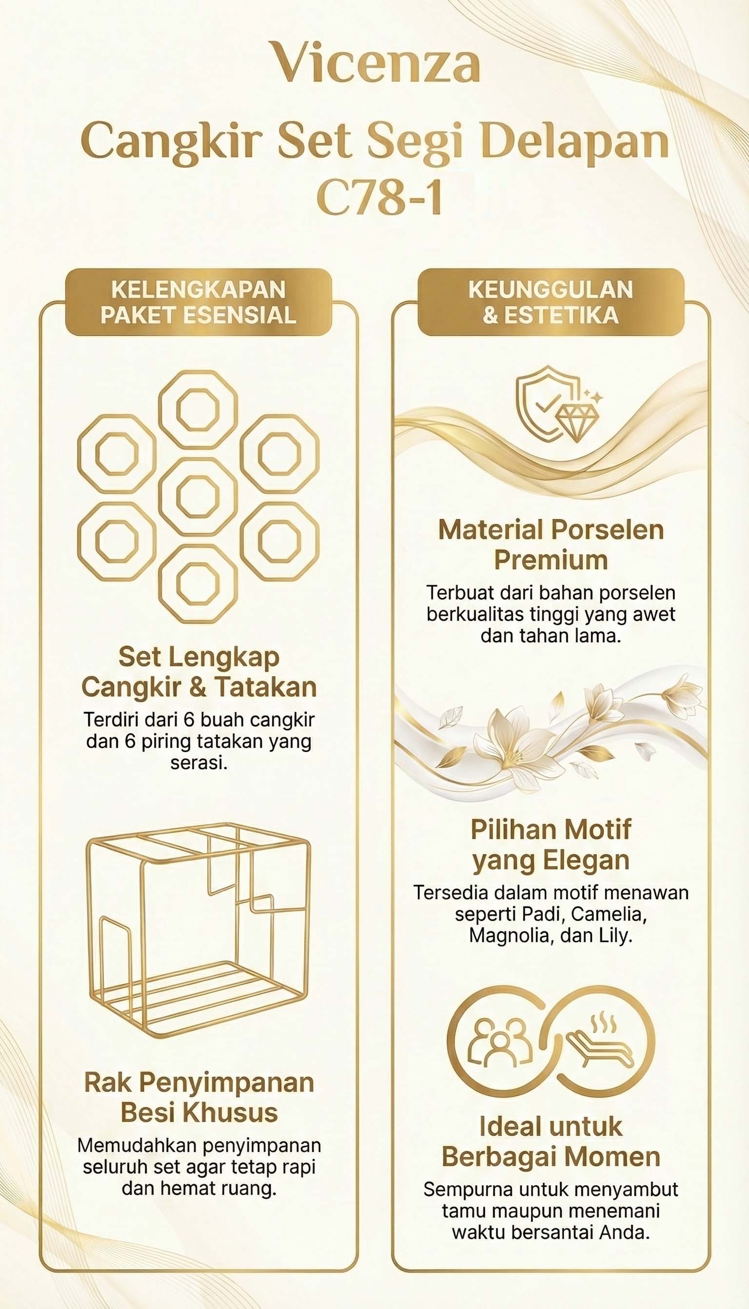 Motif Camelia yang indah memberikan nuansa elegan dan klasik pada setiap penyajian. Set ini menjamin kepraktisan dan kerapian karena terdiri dari:
