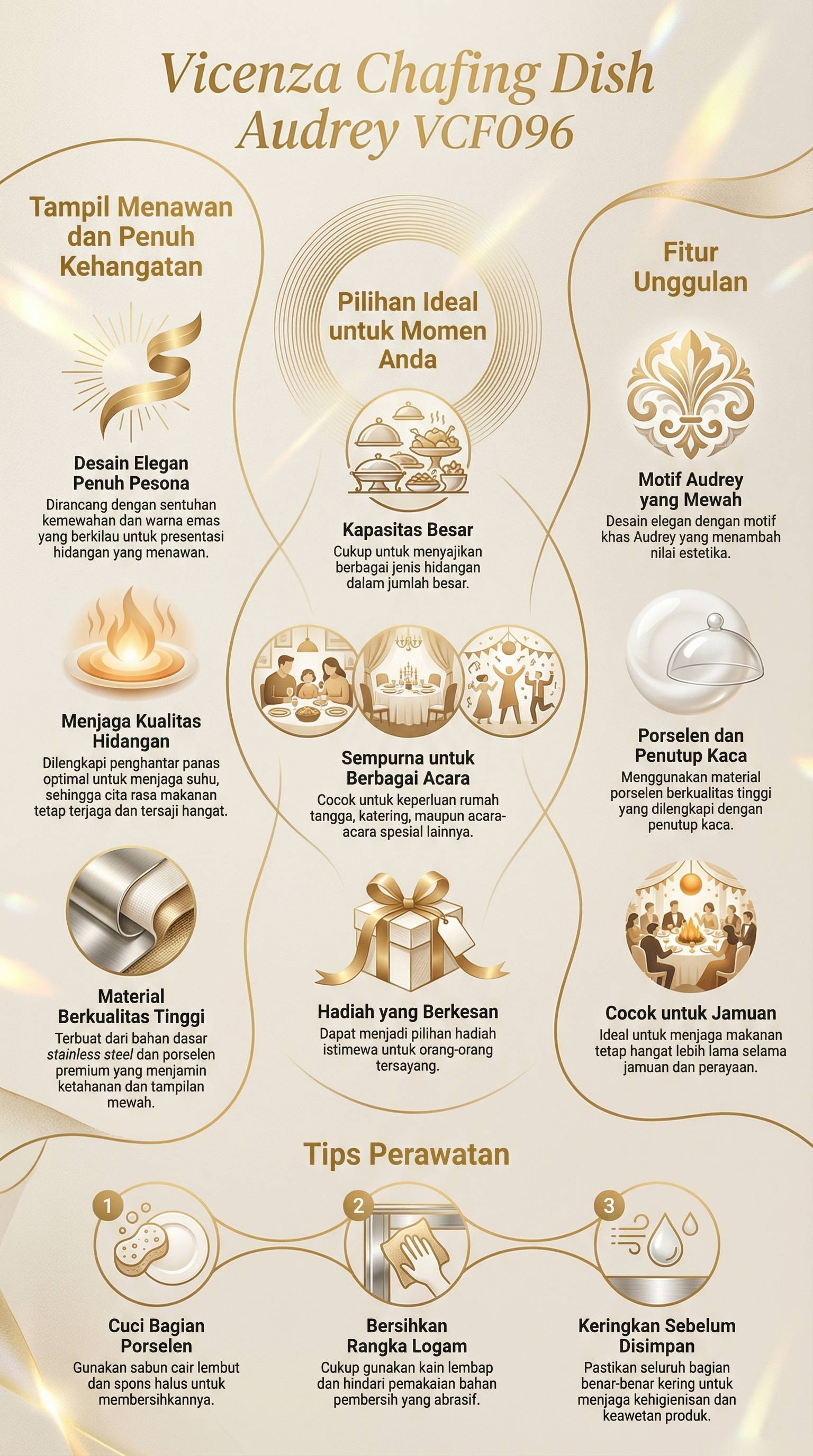 Alat saji ini dirancang dengan desain yang elegan, berbahan dasar stainless steel berkualitas, dan berwarna emas yang berkilau sehingga tampil dengan menawan penuh pesona. Pada bagian bawahnya dilengkapi dengan penghantar panas yangoptimal untuk menjaga suhu hidangan sehingga kualitas dan cita rasanya dapat terjaga. Hidangan tetap tersaji dengan penuh kehangatan bagi tamu maupun keluarga tercinta.