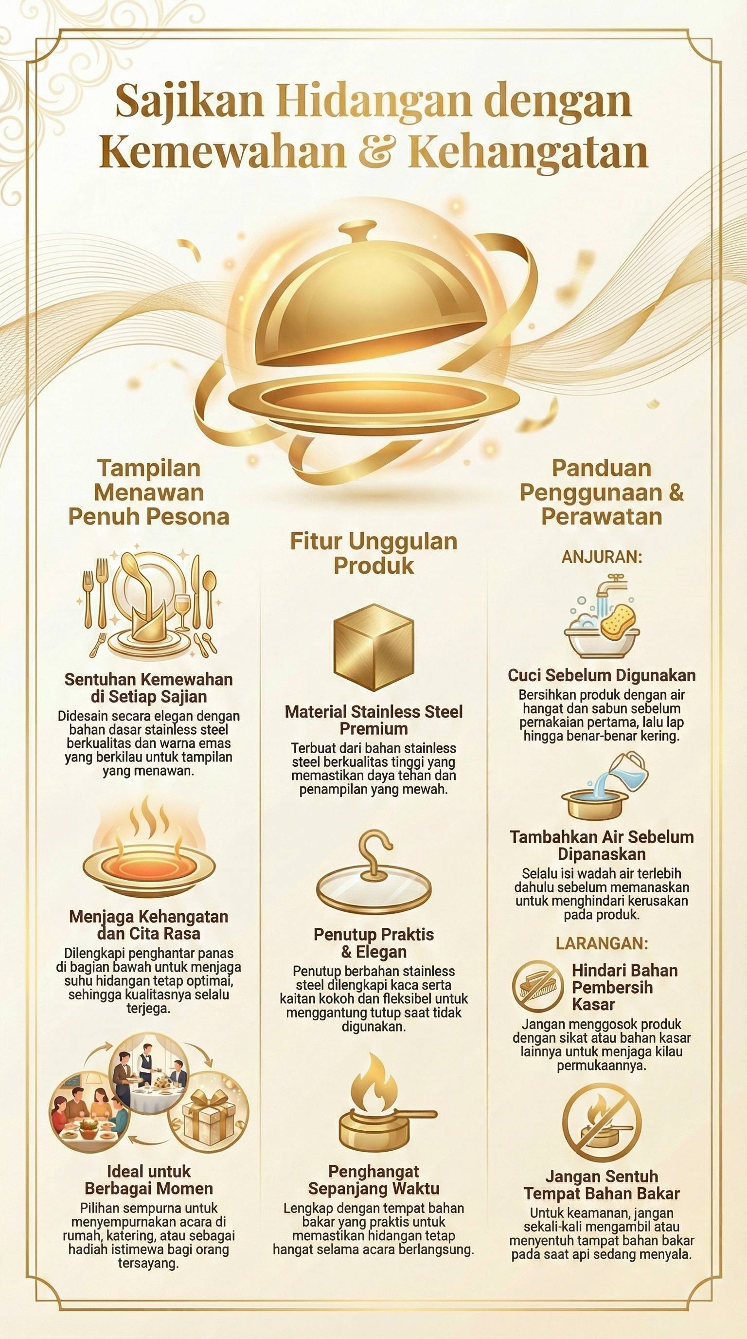 Alat saji ini dirancang dengan desain yang elegan, berbahan dasar stainless steel berkualitas, dan berwarna emas yang berkilau sehingga tampil dengan menawan penuh pesona. Pada bagian bawahnya dilengkapi dengan penghantar panas yangoptimal untuk menjaga suhu hidangan sehingga kualitas dan cita rasanya dapat terjaga. Hidangan tetap tersaji dengan penuh kehangatan bagi tamu maupun keluarga tercinta.