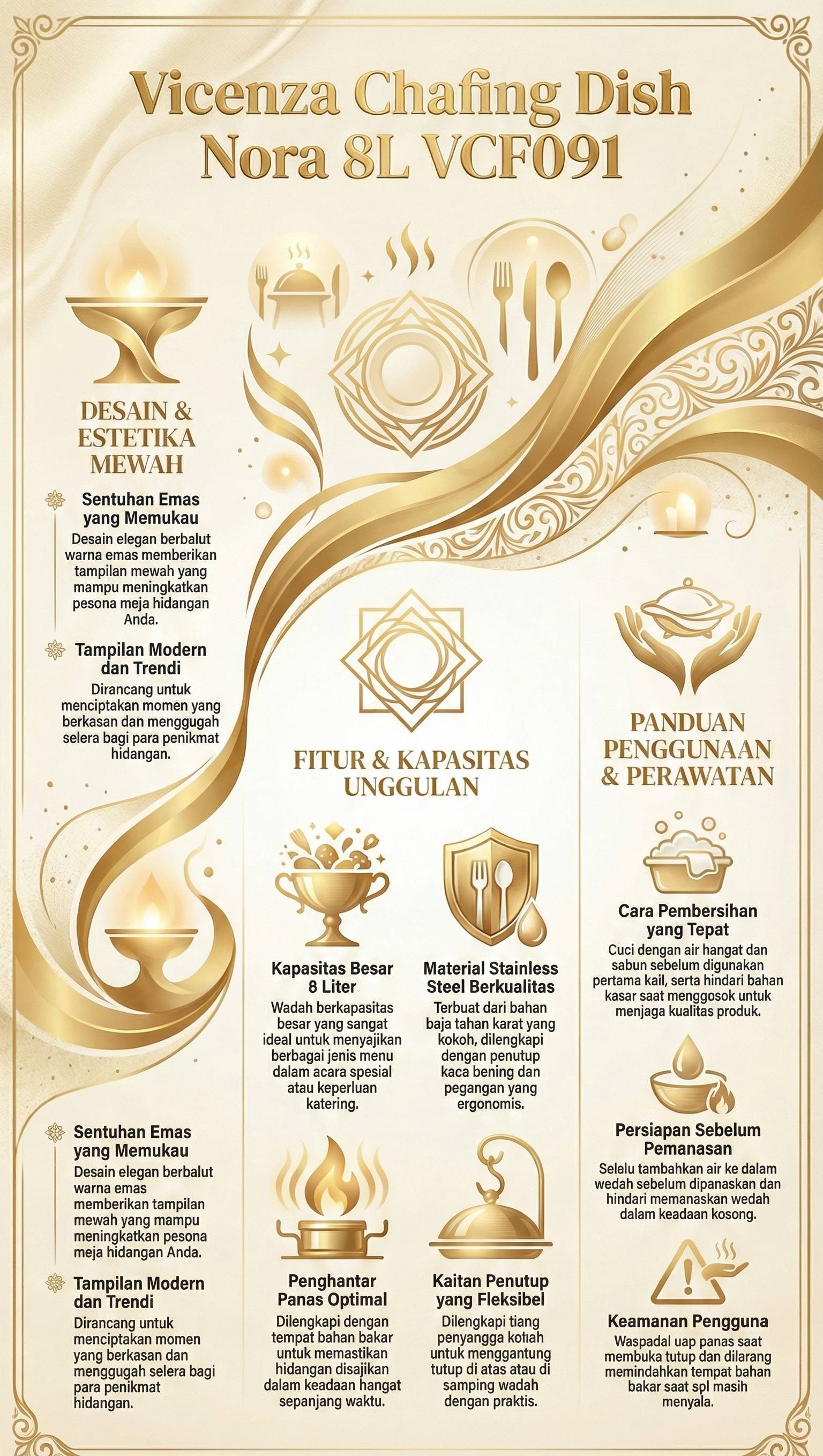 Sajikan hidangan dengan Vicenza Chafing Dish Nora 8L – VCF091 yang siap menjadi pilihan sempurna di setiap momen istimewa Anda!