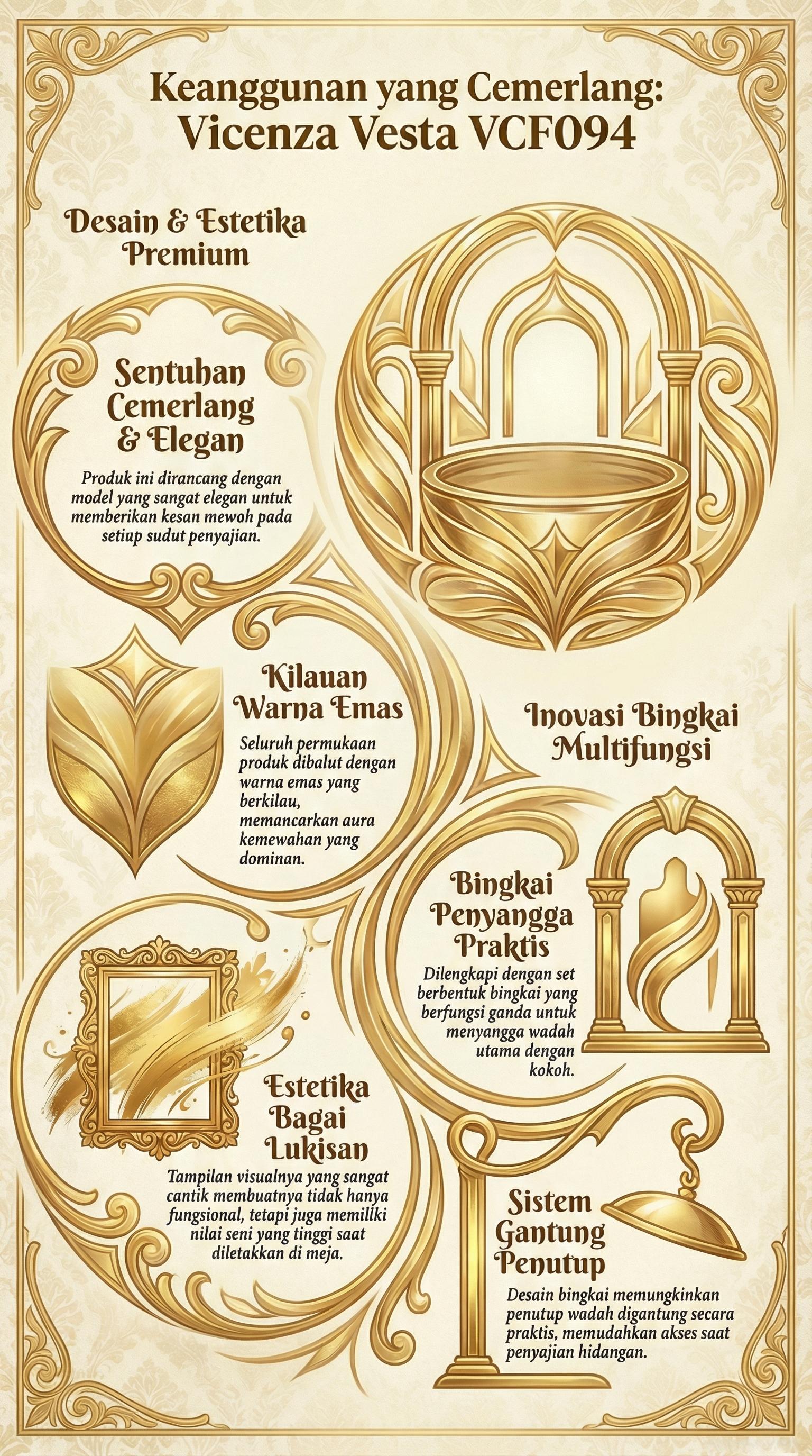 Vicenza Chafing Dish Vesta 8L – VCF094 hadir dengan sentuhan yang cemerlang. Didesain dalam model yang elegan, berbalut warna emas yang berkilau. Tampilannya terlihat semakin cantik bagai lukisan karena dilengkapi dengan set berbentuk bingkai multifungsi - menyangga wadah dan mengantung penutup dengan praktis.