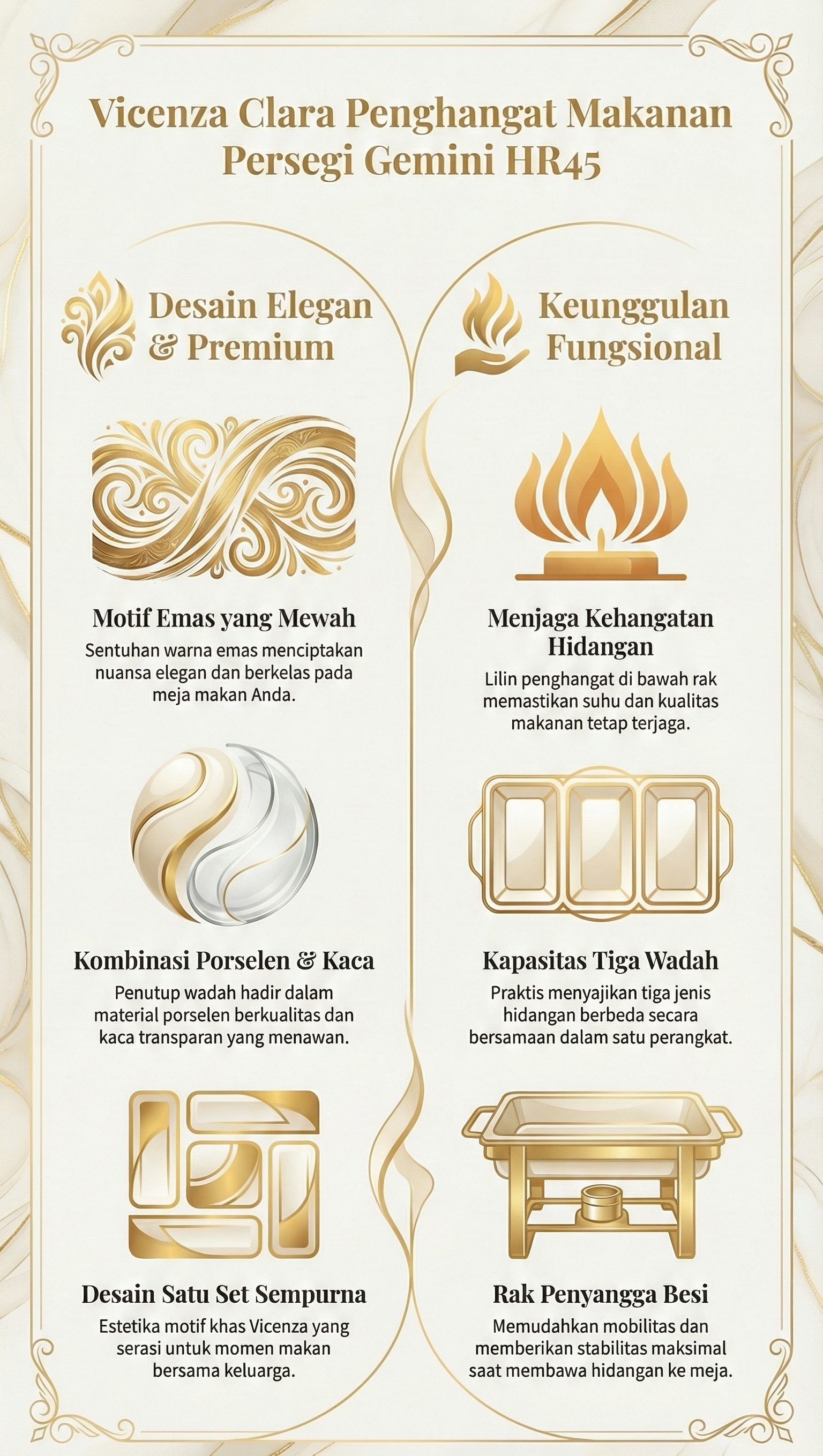Penghangat Makanan (food warmer) HR45 Clara dari Vicenza hadir sebagai pilihan tepat untuk menyajikan hidangan dengan tetap hangat dan elegan. Tiga jenis hidangan berbeda dapat tersaji secara praktis dalam kapasitas yang besar. Hadir dengan balutan motif cantik dari Vicenza dengan dominasi warna emas yang menciptakan nuansa elegan saat disajikan di meja.