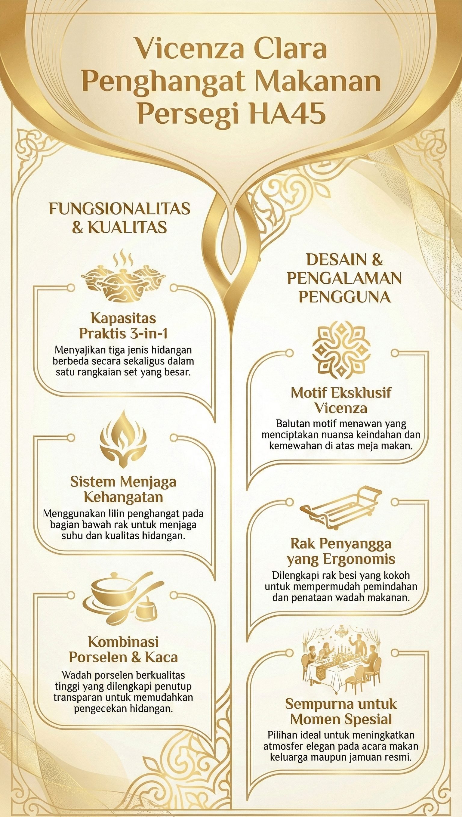 Dilengkapi dengan tiga buah penutup dengan dua jenis bahan berbeda yaitu porselen dan kaca transparan. Selain itu, produk ini juga dilengkapi rak penyangga besi untuk tempat setiap wadahnya dan memudahkan saat dibawa. Pada bagian bawah rak terdapat lilin penghangat untuk menjaga kehangatan dan kualitas hidangan yang tersaji. Semua dalam satu set, sempurna untuk agenda makan bersama keluarga maupun acara spesial.