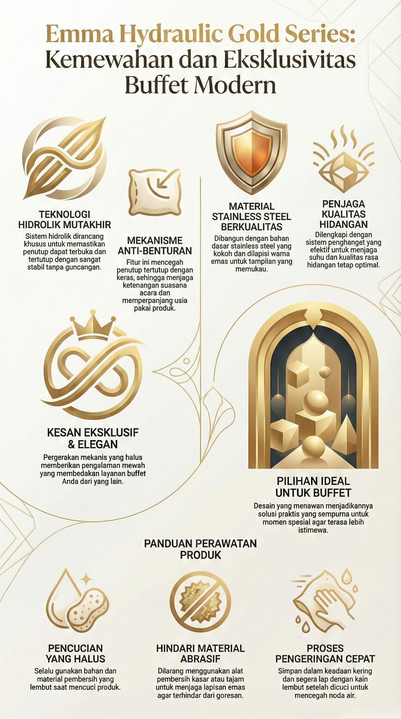 Lengkap dengan penghangat yang dapat menjaga suhu hidangan dan kualitas hidangan tetap terjaga. Dilengkapi dengan fitur baru berupa hidrolik yang didesain untuk memberi kenyamanan dan kemudahan saat digunakan: