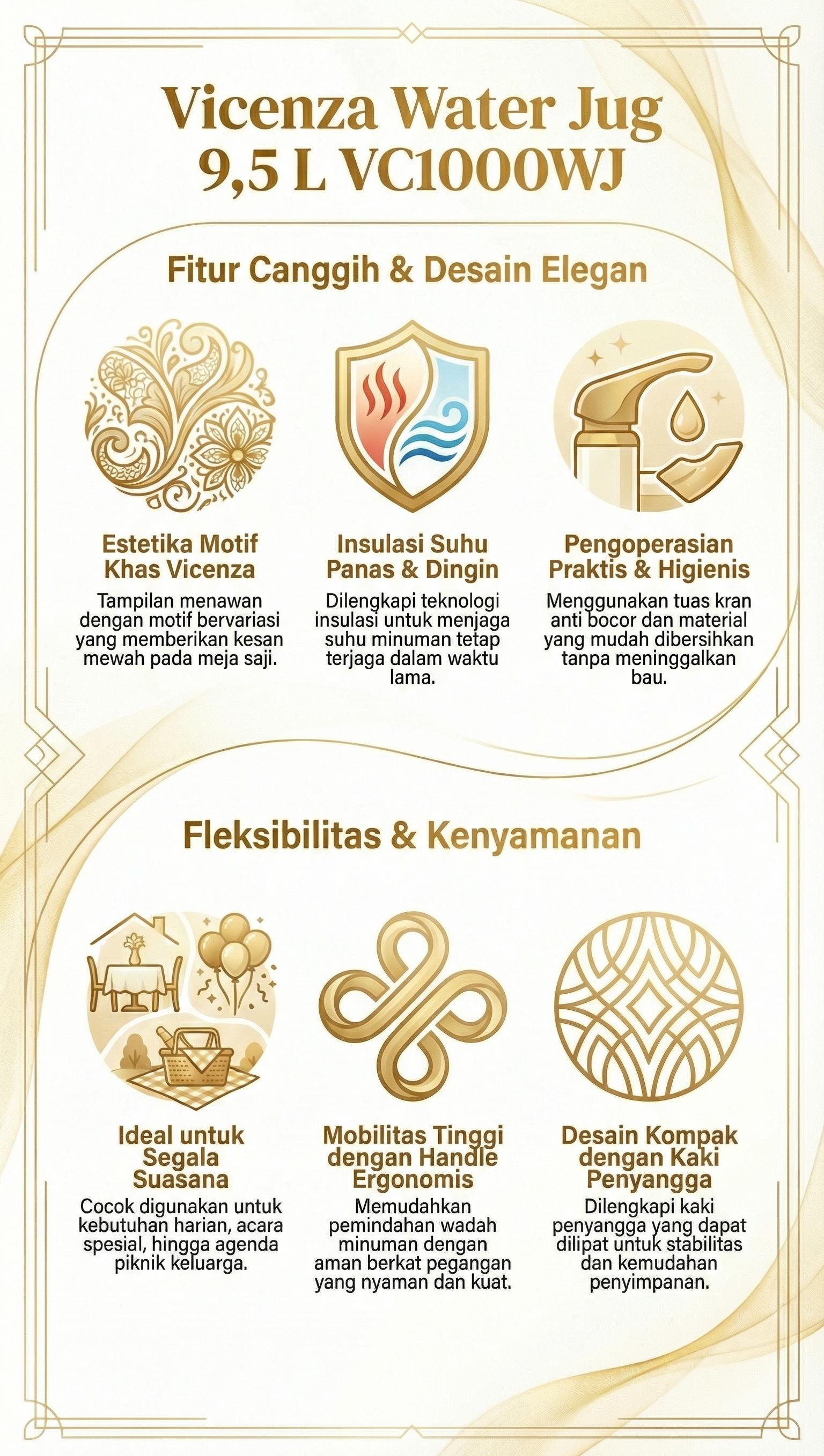 Bisa digunakan untuk kebutuhan sehari-hari, saat mengadakan acara spesial, maupun dibawa dalam agenda piknik dan berlibur bersama orang tercinta. Segera miliki dan nikmati kemudahan juga keindahan dalam menyajikan minuman dengan water jug Vicenza!