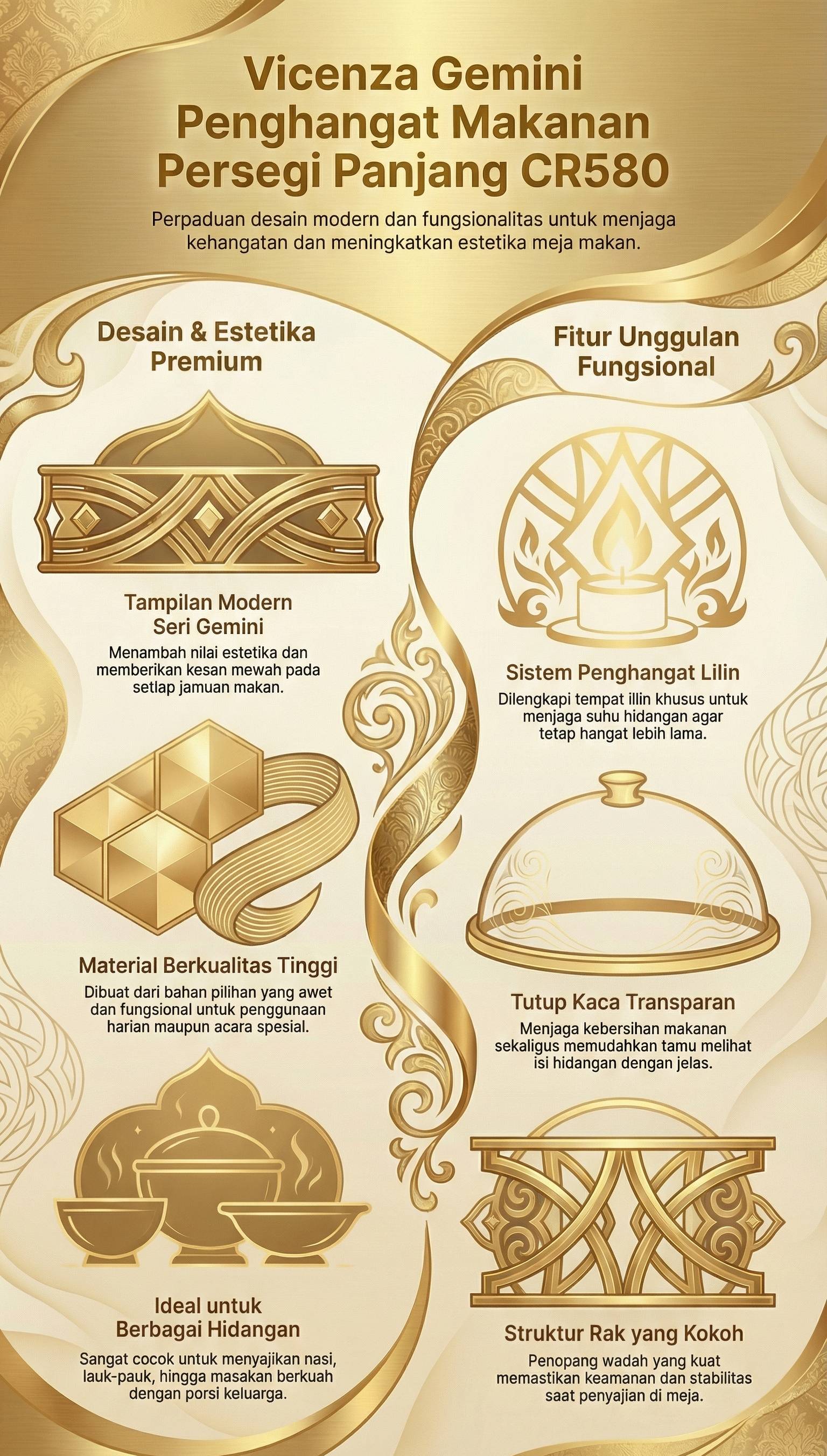 Jaga kehangatan sajian Anda dengan Vicenza Gemini Penghangat Makanan Persegi Panjang CR580, pilihan elegan untuk melengkapi meja makan di rumah maupun acara spesial. Desain persegi panjangnya memberikan ruang lebih luas untuk berbagai hidangan, sehingga cocok untuk menyajikan nasi, lauk, maupun masakan berkuah.