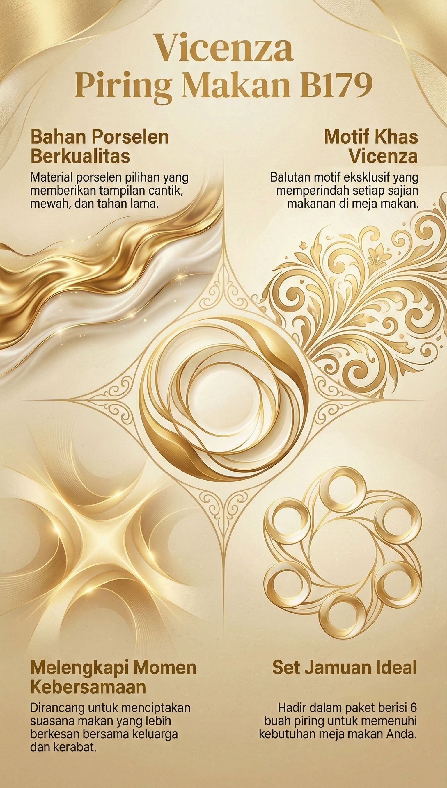 Momen makan bersama keluarga maupun kerabat terasa semakin sempurna ketika makanan disajikan dengan B179 Piring Makan dari Vicenza. Berbahan dasar porselen berkualitas yang terlihat cantik dengan balutan motif khas Vicenza. Ukurannya terbilang besar karena memiliki ukuran 22.8 cm dan 9 inci, cocok untuk memuat porsi besar agar makanan dapat dinikmati bersama. Terdiri dari 6 buah piring makan dalam satu set pembelian.