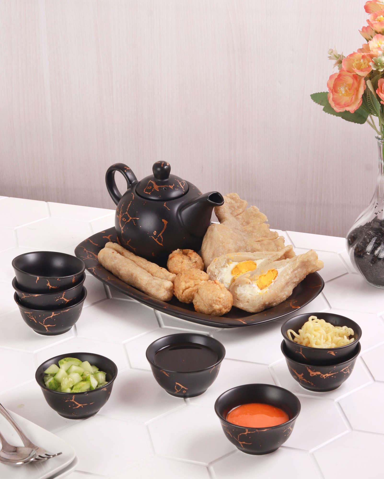 Kenikmatan Vicenza Mangkuk Pempek dan Teko Cuko Set Motif Marmer – Hitam BM902 : lengkap dengan segala yang Anda butuhkan untuk menikmati hidangan Pempek secara istimewa. Set eksklusif ini mencakup 1 teko Cuko dengan tutup, 8 mangkuk kecil cuko, dan 1 piring - semuanya dihiasi dengan motif Marble yang memikat.