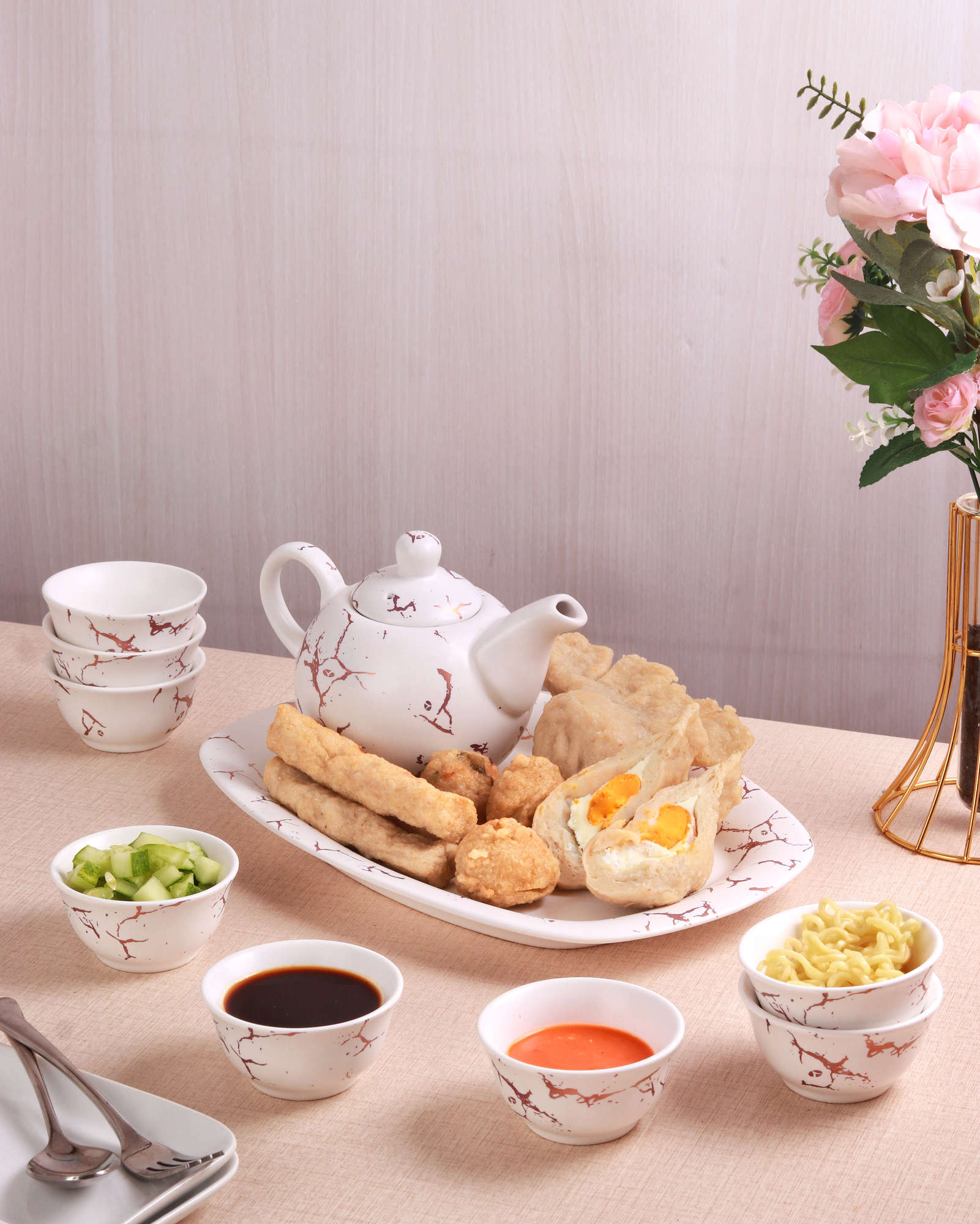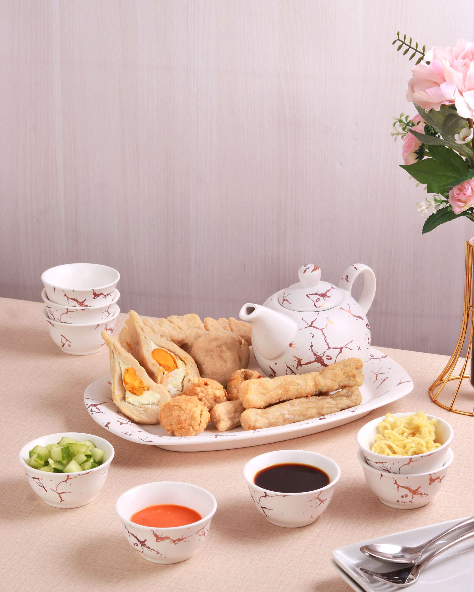 Tak perlu repot-repot mencari perlengkapan, karena set ini telah merangkul kepraktisan dan keindahan dalam satu paket. Teko cuko dengan tutup menjaga kelezatan saus cuko Anda, sementara 8 mangkuk kecil memungkinkan Anda menyajikan Pempek dengan variasi cita rasa yang memikat.