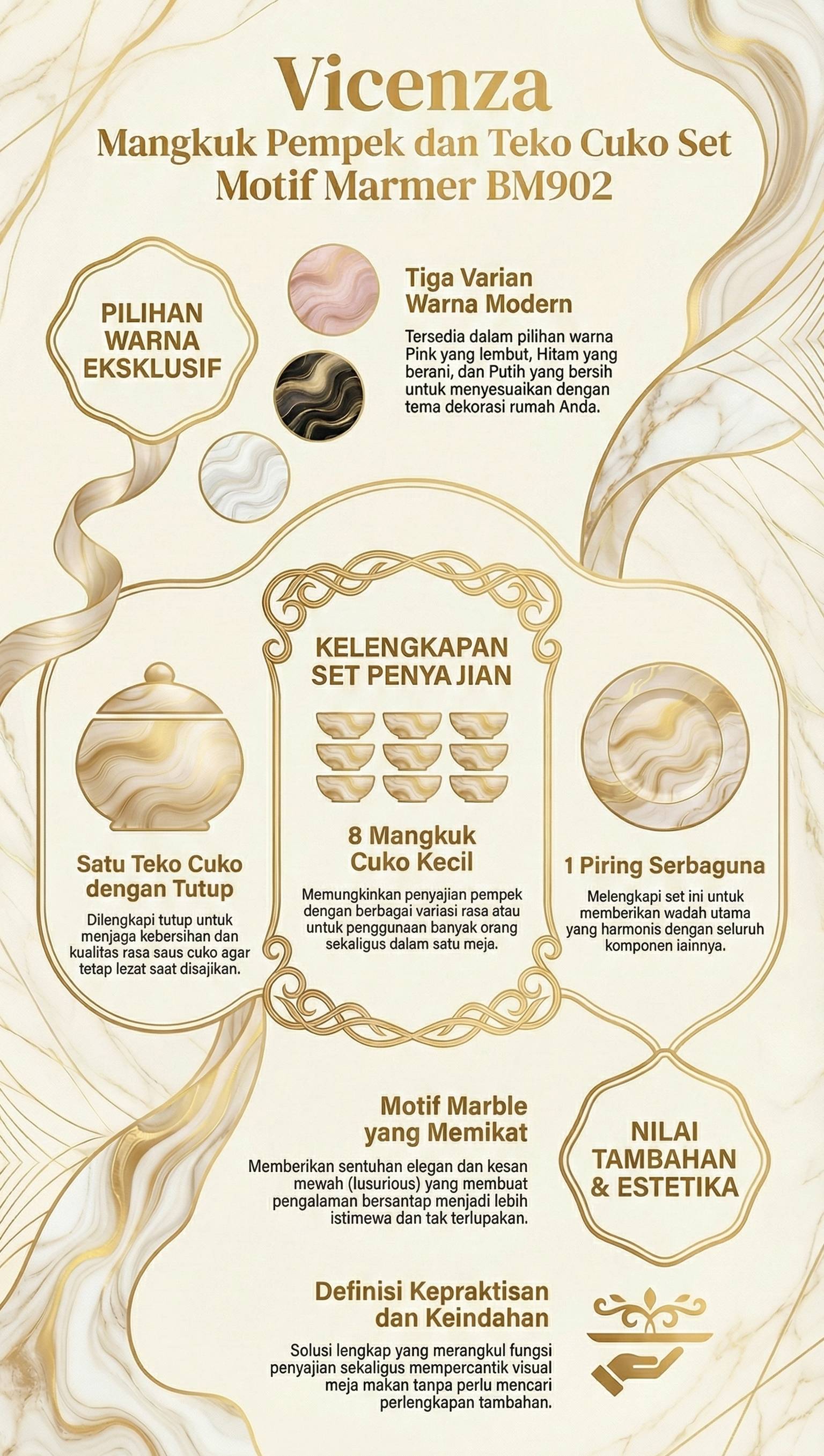 Kenikmatan Vicenza Mangkuk Pempek dan Teko Cuko Set Motif Marmer – Putih BM902 : lengkap dengan segala yang Anda butuhkan untuk menikmati hidangan Pempek secara istimewa. Set eksklusif ini mencakup 1 teko Cuko dengan tutup, 8 mangkuk kecil cuko, dan 1 piring - semuanya dihiasi dengan motif Marble yang memikat.