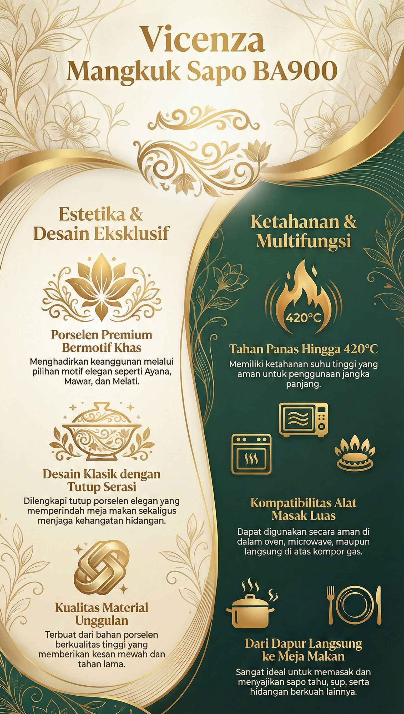 Vicenza Mangkuk Sapo Motif Melati BA900 adalah pilihan ideal untuk menyajikan hidangan berkuah dengan tampilan elegan. Terbuat dari porselen premium bermotif Melati khas Vicenza, mangkuk ini tahan panas hingga 420°C sehingga aman digunakan di microwave, oven, maupun kompor gas.
