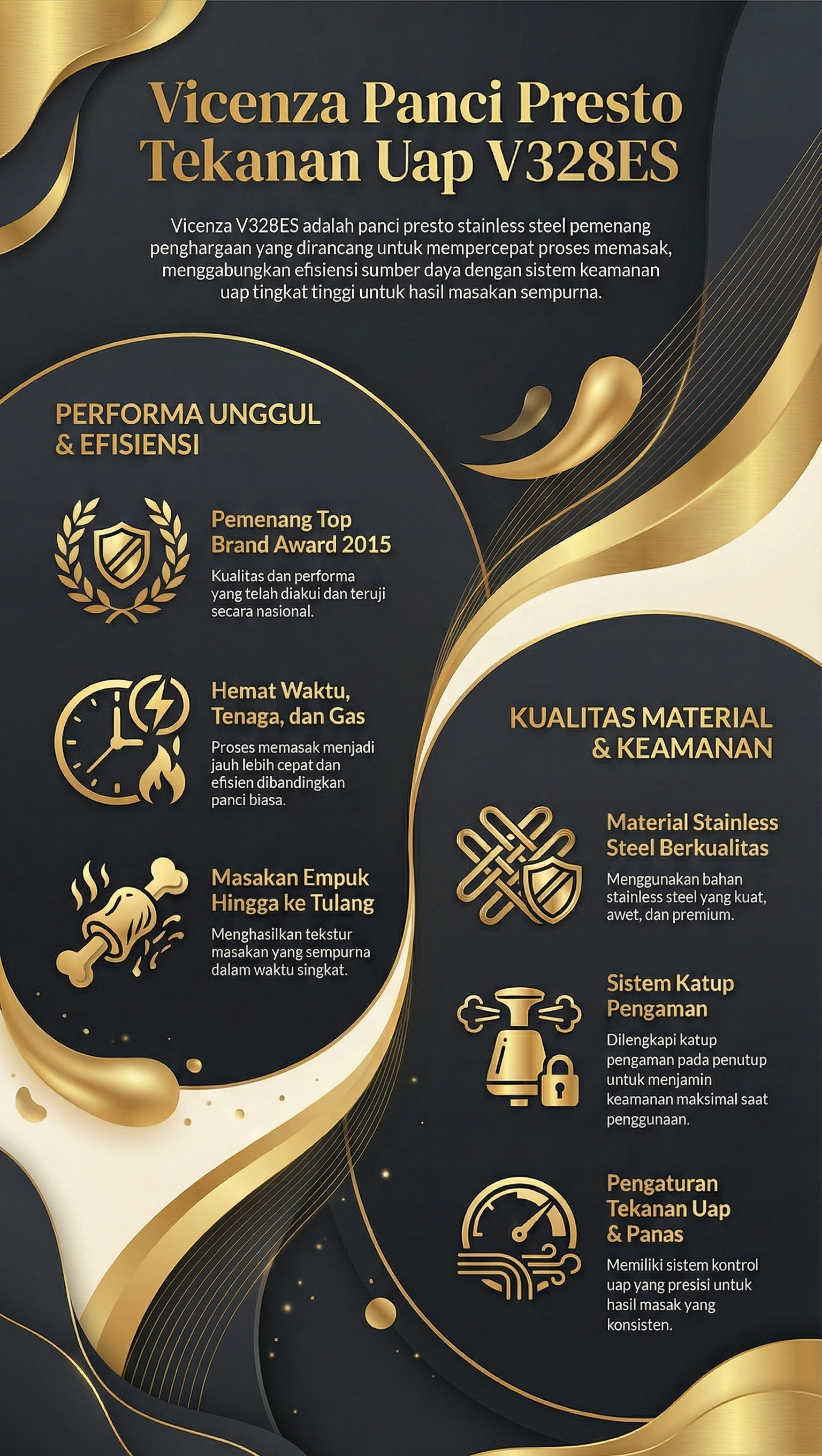 Masak lebih cepat dan hemat dengan V328ES Panci Presto Stainless dari Vicenza! Hadir dengan kualitas dan performa yang unggul, stainless steel pressure cooker dari Vicenza berhasil meraih TOP BRAND AWARD 2015.