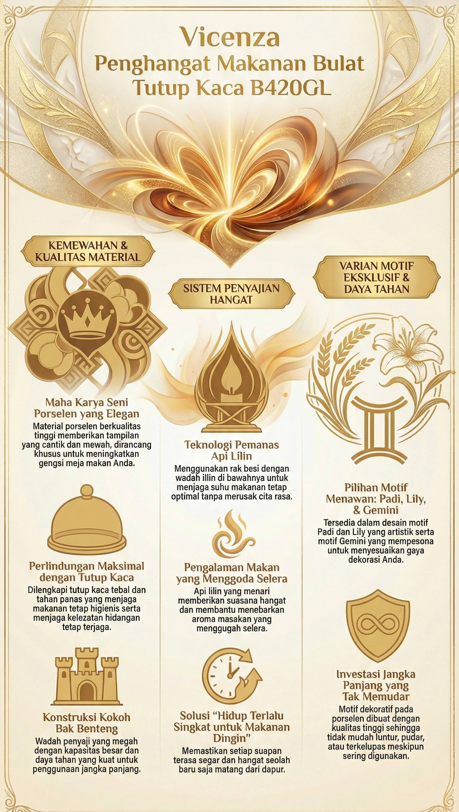 Tersedia dalam motif Padi dan Lily yang menawan serta Gemini yang memesona. Motif-motif ini, saudara-saudara, tidak mudah pudar, luntur, atau terkelupas. Sebuah investasi yang tak ternilai untuk mempercantik perlengkapan makan Anda. Tunggu apa lagi? Segera miliki Vicenza Penghangat Makanan Bulat Tutup Kaca Lily B420GL dan rasakan perbedaannya! Hidup ini terlalu singkat untuk makanan dingin!