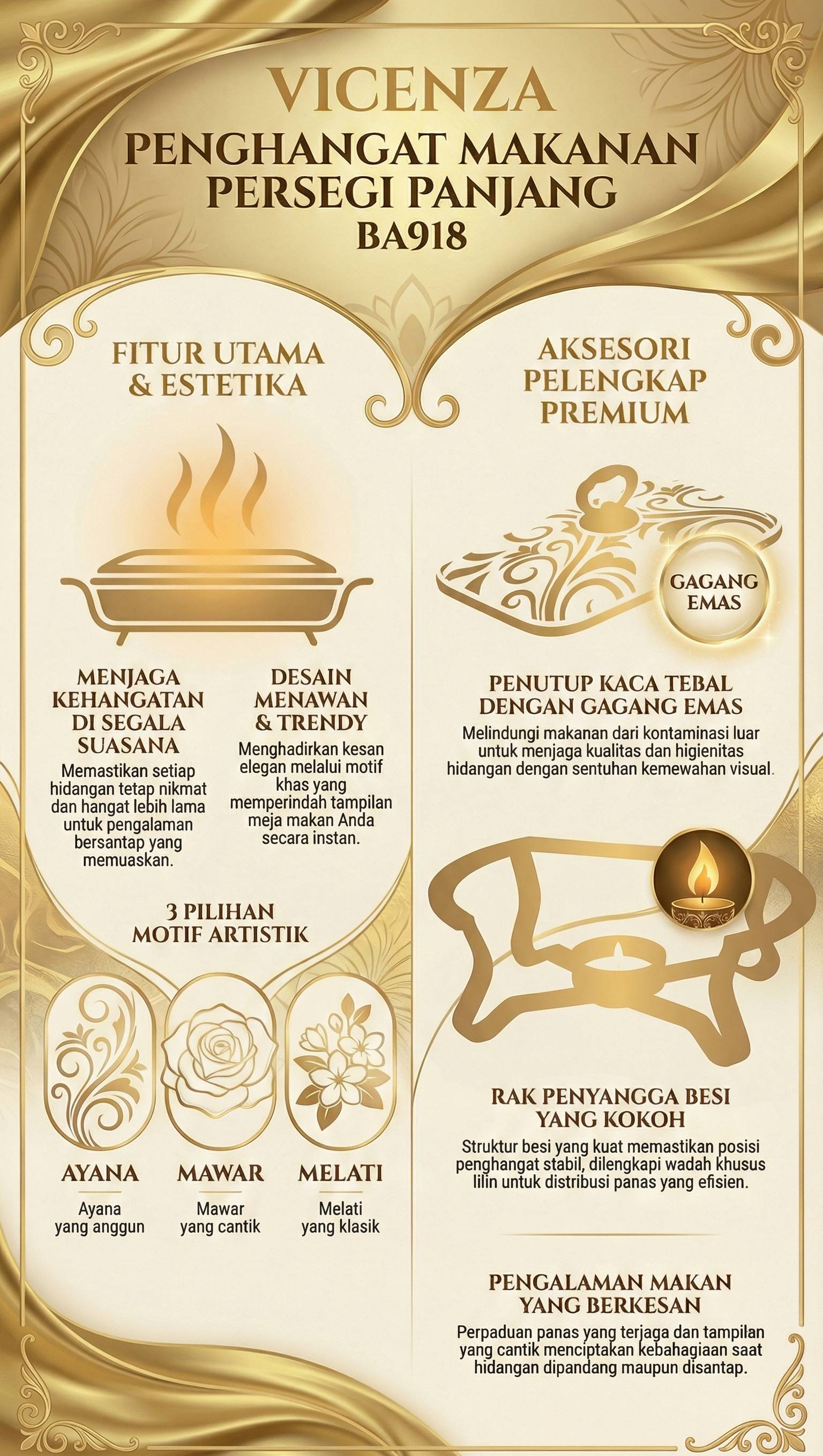 Nikmati kehangatan dan kelezatan makanan Anda dengan penghangat makanan (Vicenza Penghangat Makanan Persegi Panjang – Mawar BA918) berbentuk persegi satu ini! Pengalaman menikmati hidangan semakin memuaskan karena kehangatannya tetap terjaga di segala suasana. Hadir dengan desain menawan berupa motif mawar khas Vicenza menambah keanggunannya dan memperindah tampilan meja makan Anda.