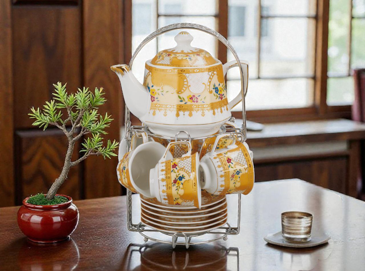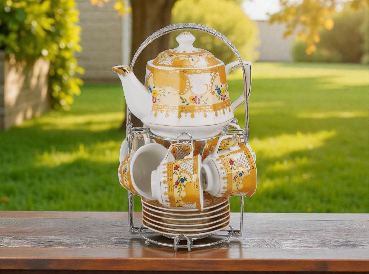Dengan produk ini, teh dapat disajikan dan dinikmati dengan praktis. Terdiri dari 6 buah cangkir, 6 buah piring, dan 1 buah teko beserta penutup yang terbuat dari porselen serta 1 buah rak untuk mempermudah saat disimpan sehingga tidak berantakan. Semua dalam satu set, tidak perlu membeli secara terpisah.