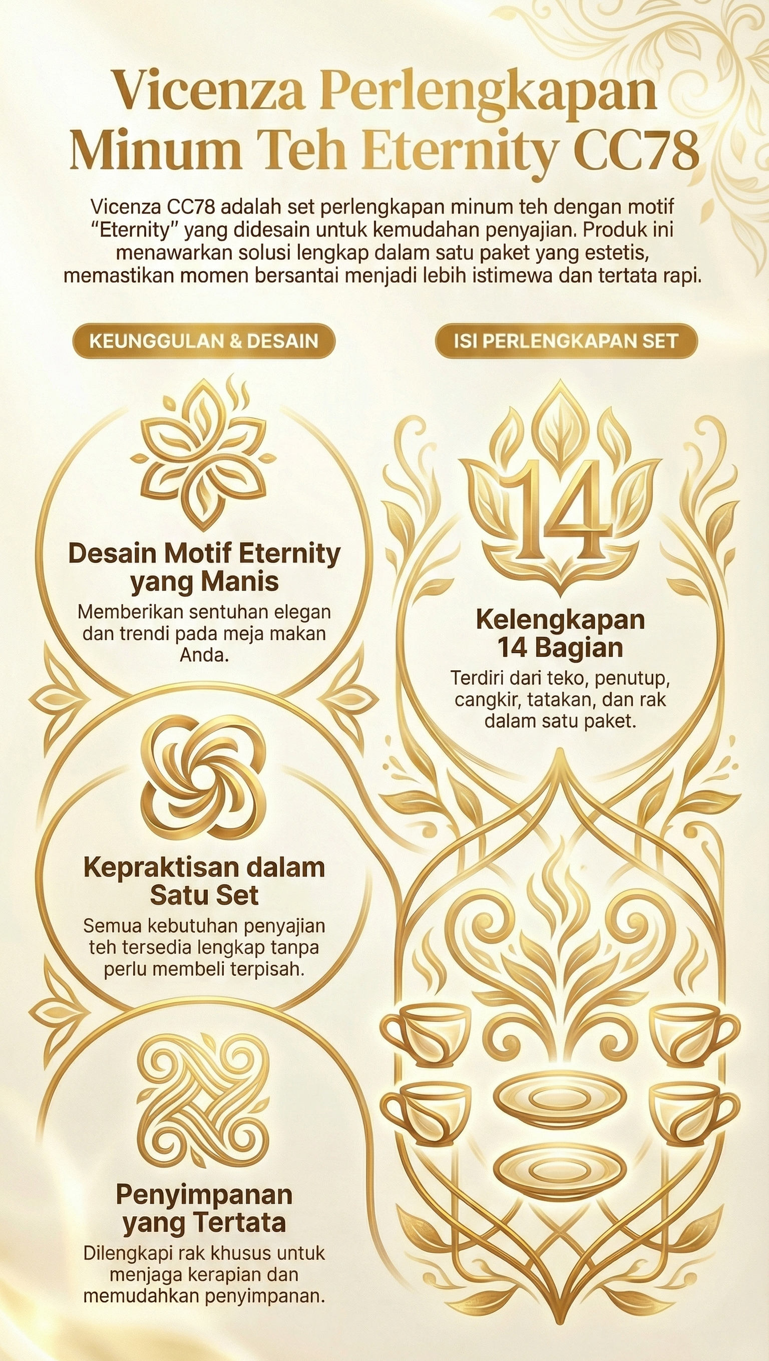 Waktu bersantai dan berbincang dengan teman maupun keluarga, paling asyik dengan ditemani secangkir minuman! Apalagi dengan kehadiran CC78 Perlengkapan Minum Teh dari Vicenza yang praktis dengan desain motif Eternity yang manis.