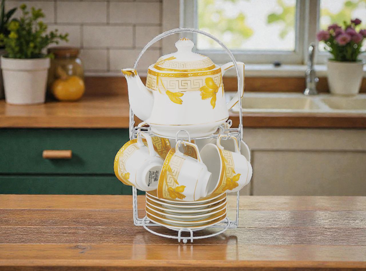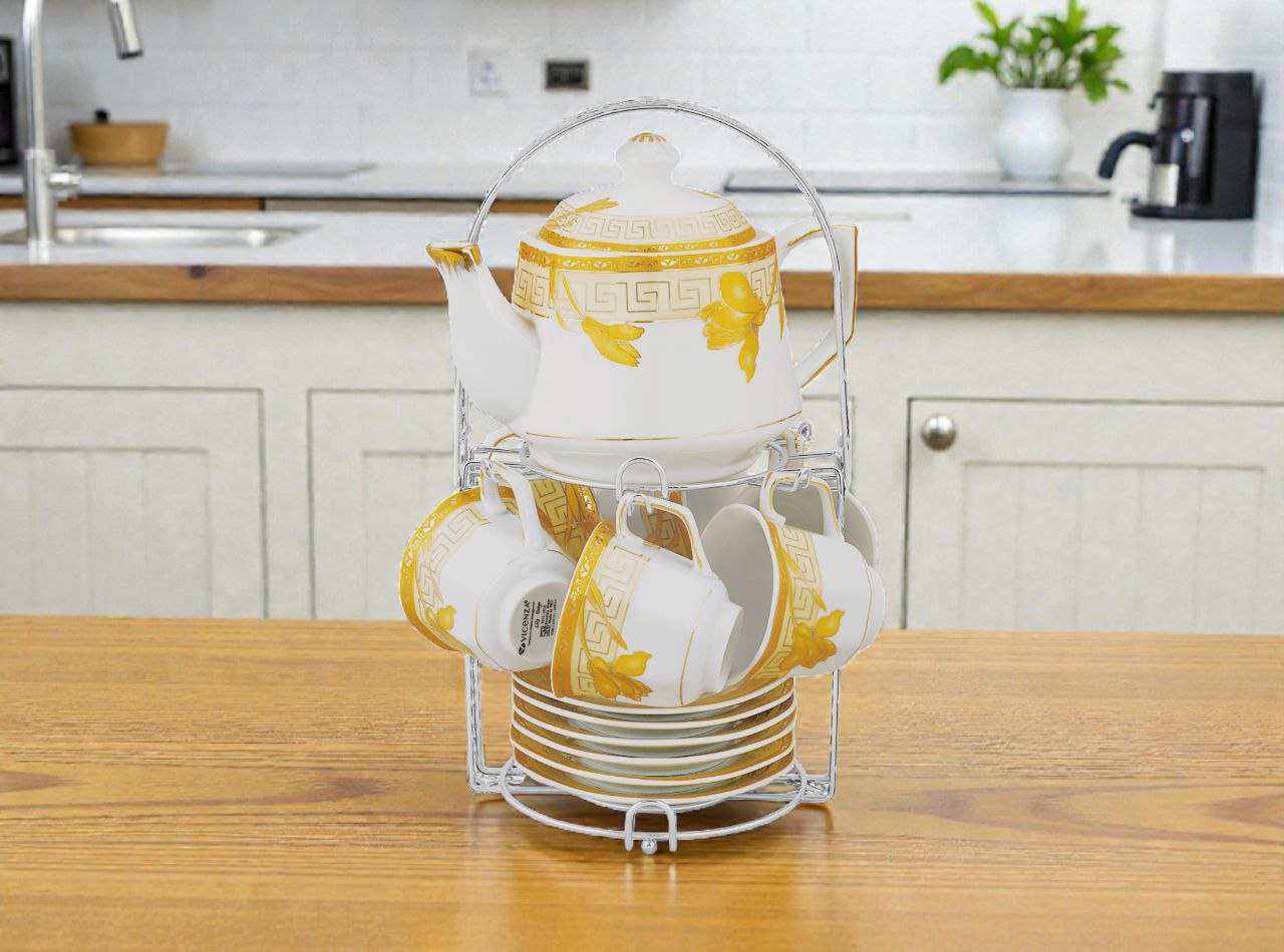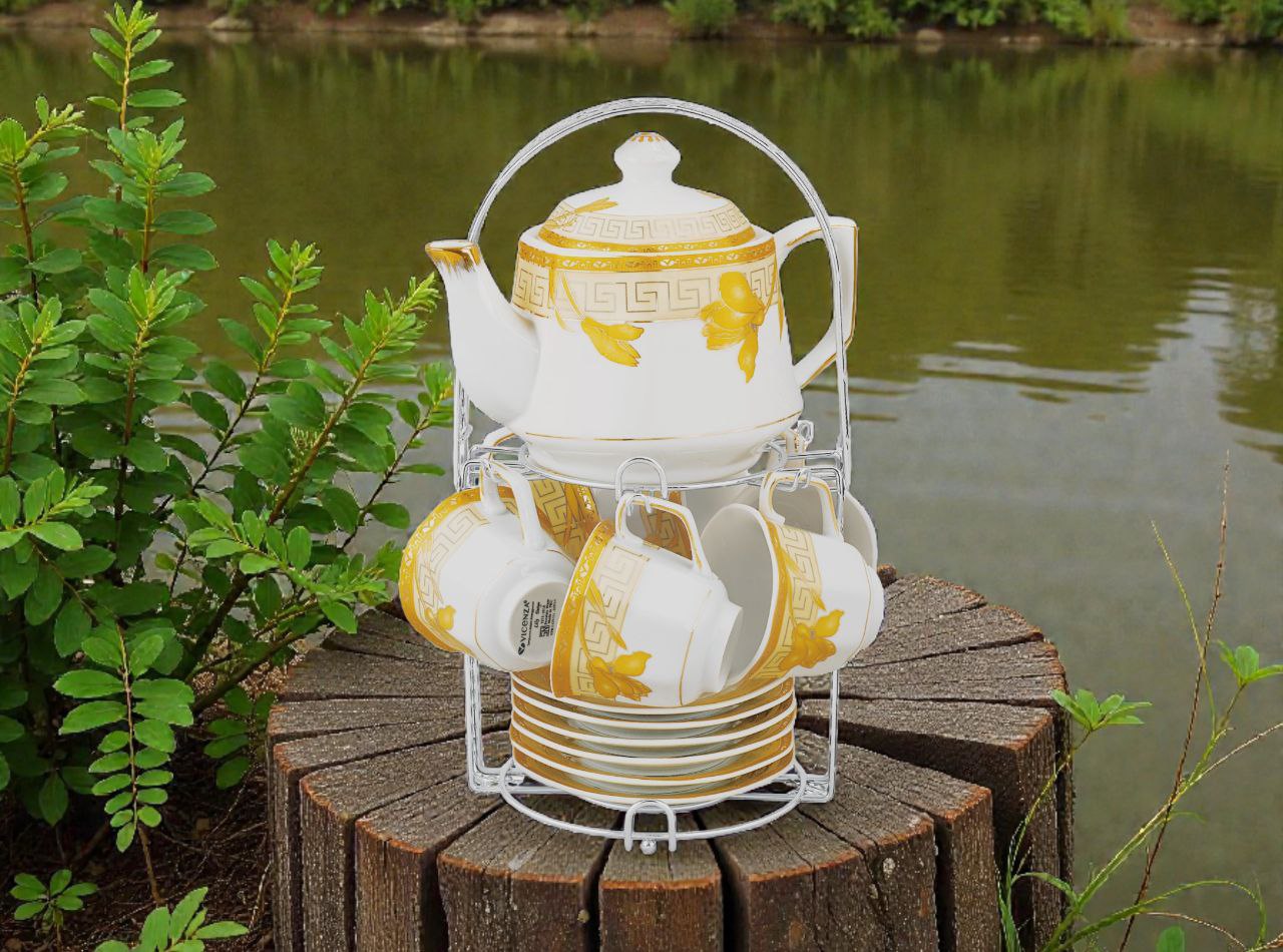 Dengan produk ini, teh dapat disajikan dan dinikmati dengan praktis. Terdiri dari 6 buah cangkir, 6 buah piring, dan 1 buah teko beserta penutup yang terbuat dari porselen serta 1 buah rak untuk mempermudah saat disimpan sehingga tidak berantakan. Semua dalam satu set, tidak perlu membeli secara terpisah.
