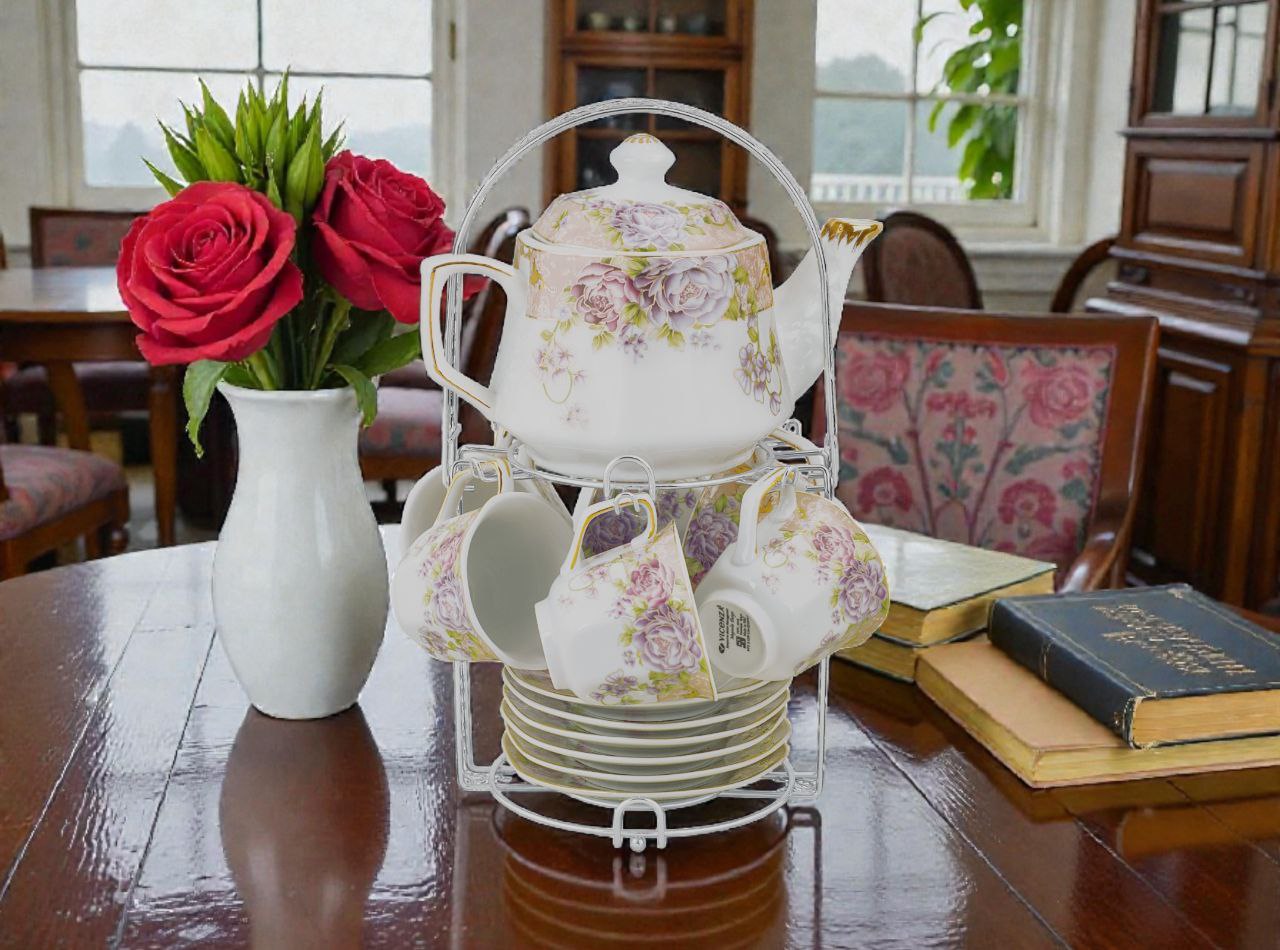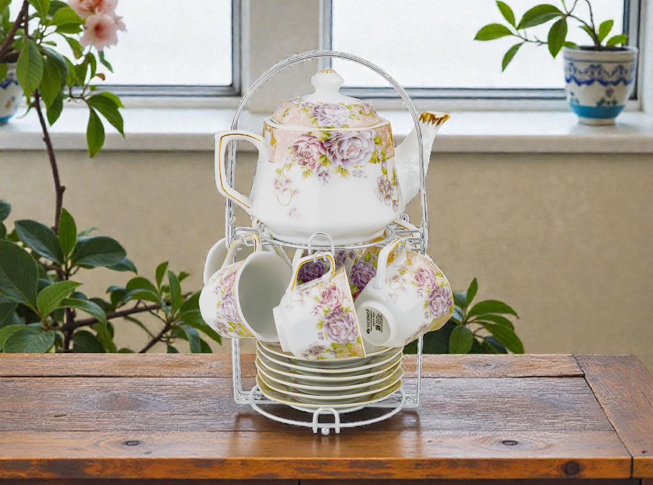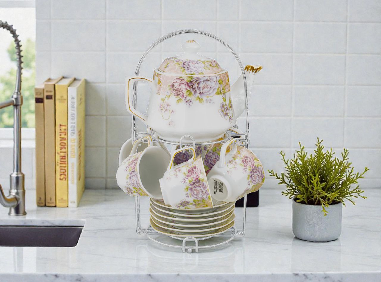 Dengan produk ini, teh dapat disajikan dan dinikmati dengan praktis. Terdiri dari 6 buah cangkir, 6 buah piring, dan 1 buah teko beserta penutup yang terbuat dari porselen serta 1 buah rak untuk mempermudah saat disimpan sehingga tidak berantakan. Semua dalam satu set, tidak perlu membeli secara terpisah.