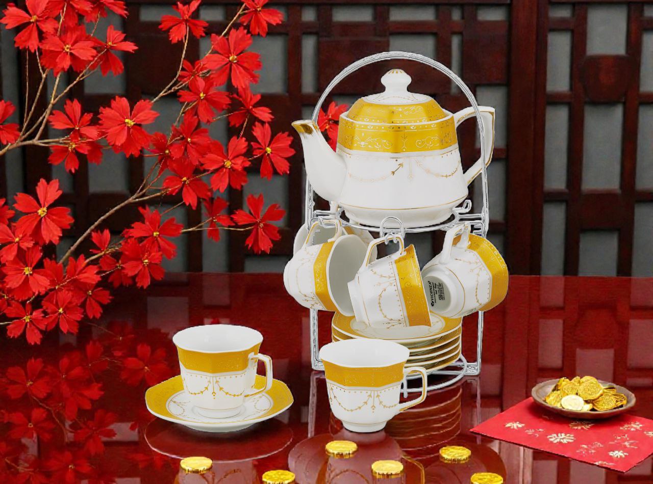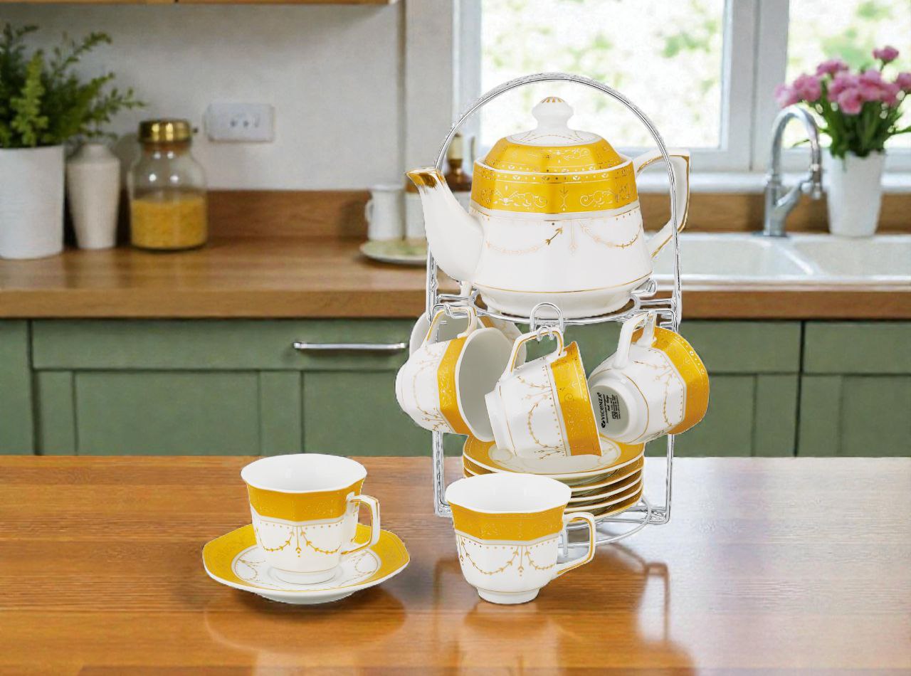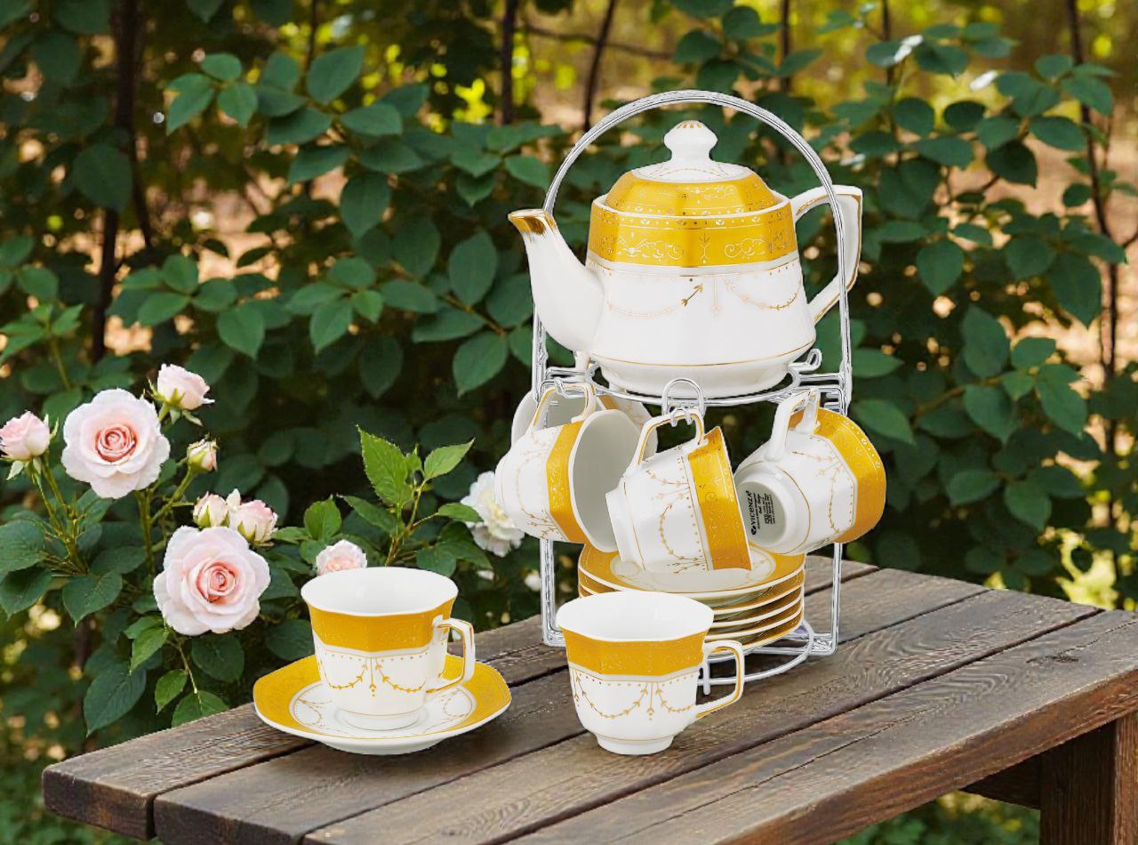 Dengan produk ini, teh dapat disajikan dan dinikmati dengan praktis. Terdiri dari 6 buah cangkir, 6 buah piring, dan 1 buah teko beserta penutup yang terbuat dari porselen serta 1 buah rak untuk mempermudah saat disimpan sehingga tidak berantakan. Semua dalam satu set, tidak perlu membeli secara terpisah.
