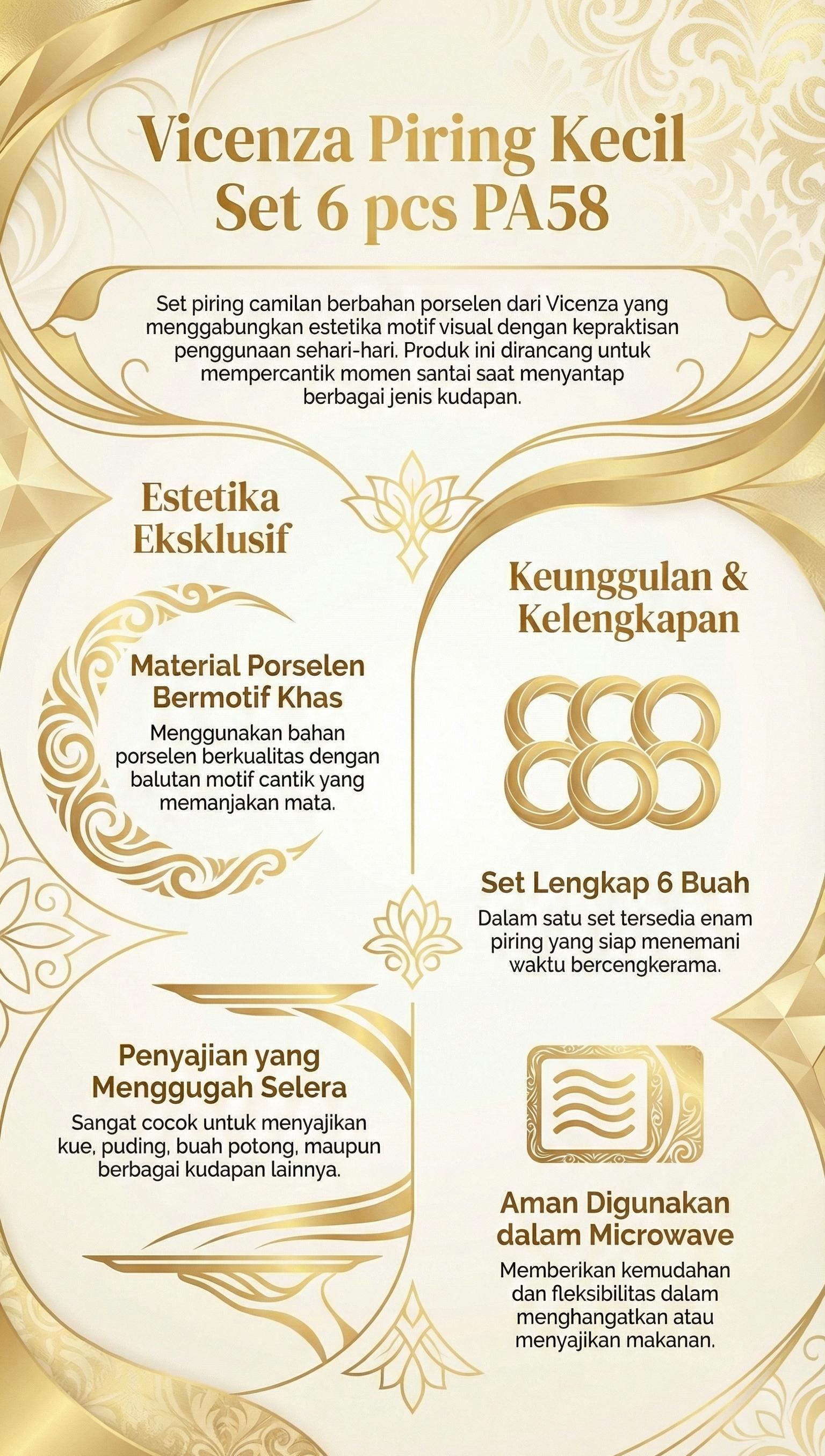 Piring ini berbahan dasar porselen dengan balutan motif cantik khas Vicenza yang memanjakan mata. Terdiri dari enam buah piring dalam satu setnya. Keistimewaannya tidak hanya itu saja, piring ini juga aman untuk digunakan dalam microwave. Segera miliki dan sempurnakan waktu menyantap camilan bersama Vicenza!