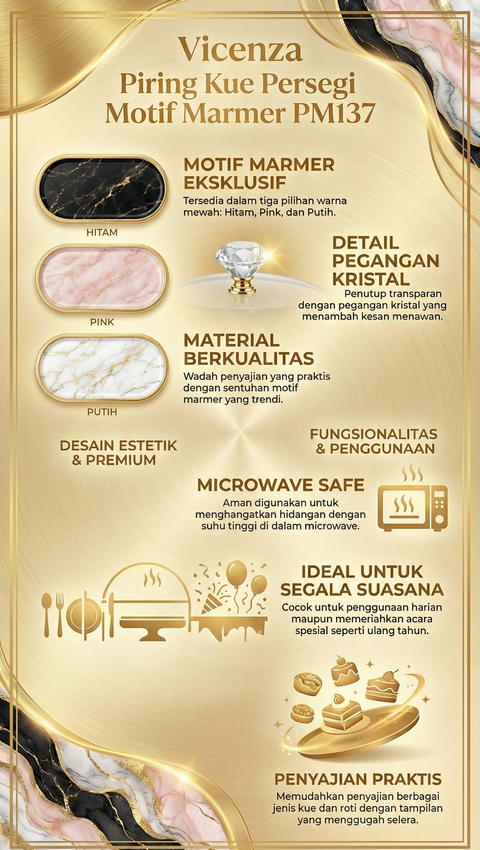 Cocok untuk digunakan sehari-hari maupun memeriahkan acara seperti ulang tahun supaya terasa semakin spesial. Dapat digunakan dalam microwave sehingga aman untuk menghangatkan hidangan dengan suhu tinggi. Segera miliki dan sajikan kudapan dengan tempat kue dari Vicenza!
