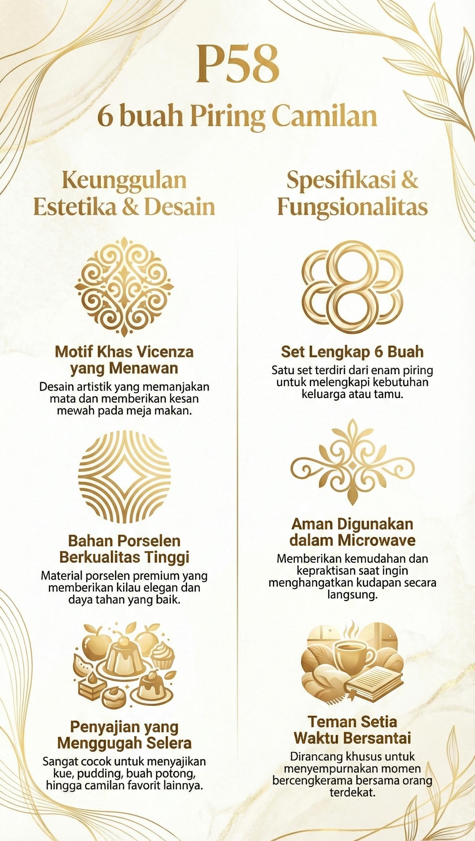 Vicenza 6 Buah Piring Saji Camilan Motif Camelia P58 adalah set piring porselen elegan yang memberikan kesan mewah pada meja makan Anda. Dihiasi motif camelia dengan sentuhan emas yang anggun, piring ini cocok digunakan untuk berbagai kesempatan, mulai dari santapan keluarga, arisan, hingga jamuan resmi. Satu set terdiri dari enam piring camilan berukuran praktis, ideal untuk menyajikan snack, kue, buah, atau makanan pendamping.