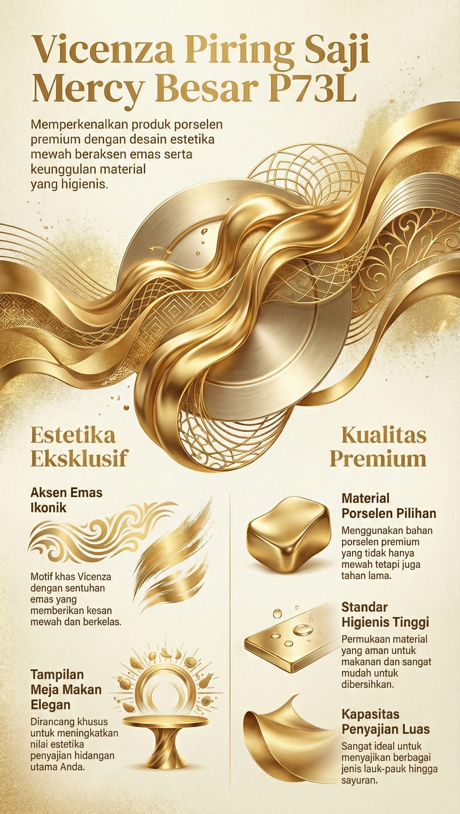 Vicenza Piring Mercy Besar Camelia P73L adalah piring saji porselen premium dengan motif Camelia beraksen emas yang mewah. Memiliki ukuran 31 x 31 x 3,5 cm dengan kapasitas 1500 ml, piring ini sempurna untuk menyajikan lauk, sayuran, hingga hidangan utama dengan tampilan berkelas.