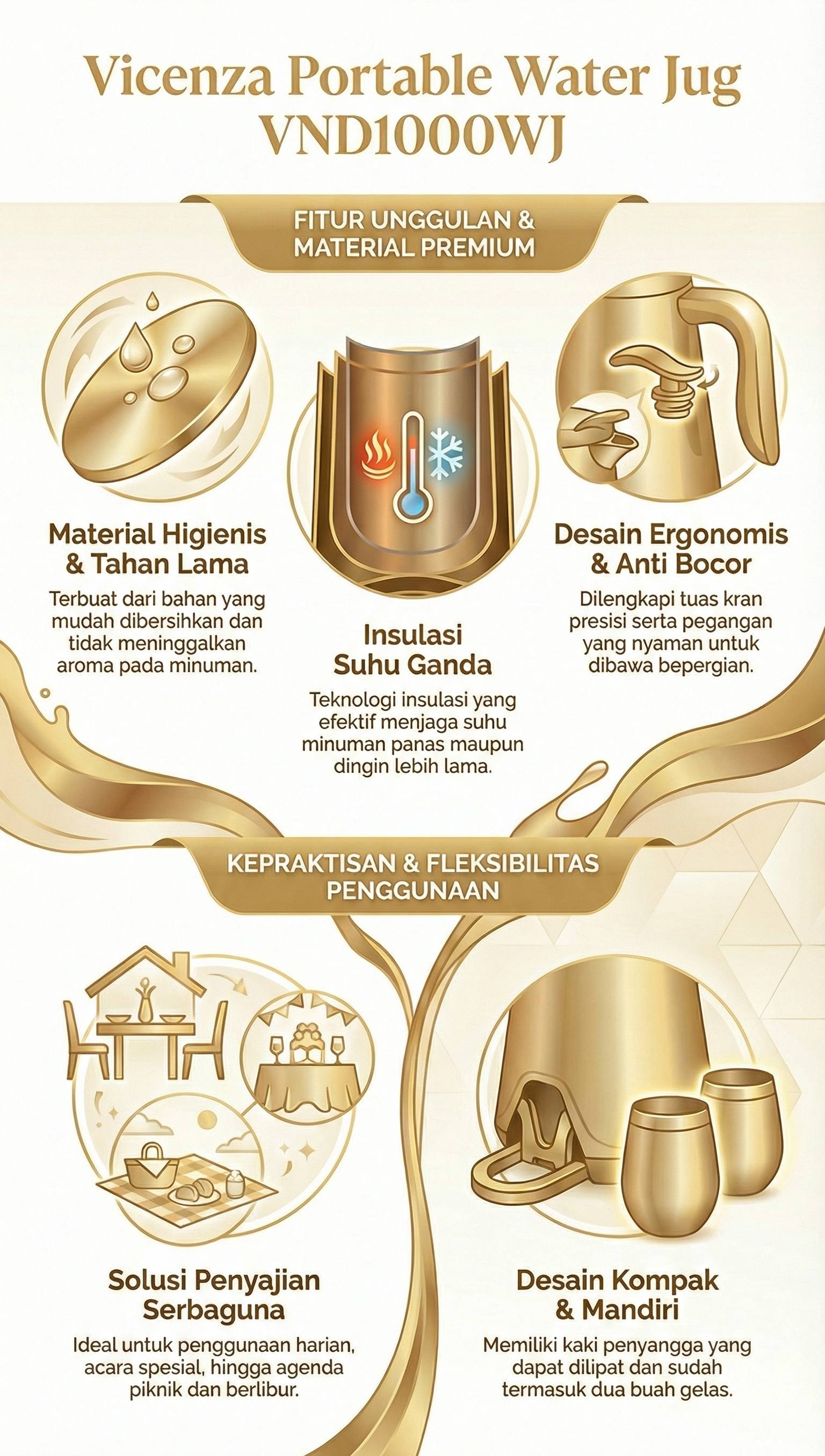 Water jug ini memiliki fitur yang lengkap. Terdiri dari handle ergonomis yang mudah untuk dibawa serta tuas kran anti bocor untuk menuangkan minuman. Dilengkapi dengan insulasi sehingga suhu minuman lebih terjaga dalam waktu lama, tahan panas dan dingin. Bagian bawah water jug juga dilengkapi kaki penyangga yang dapat dilipat. Tersedia dua buah gelas plastik yang dapat digunakan untuk menikmati minuman. Semua dalam satu set, terasa lebih praktis.