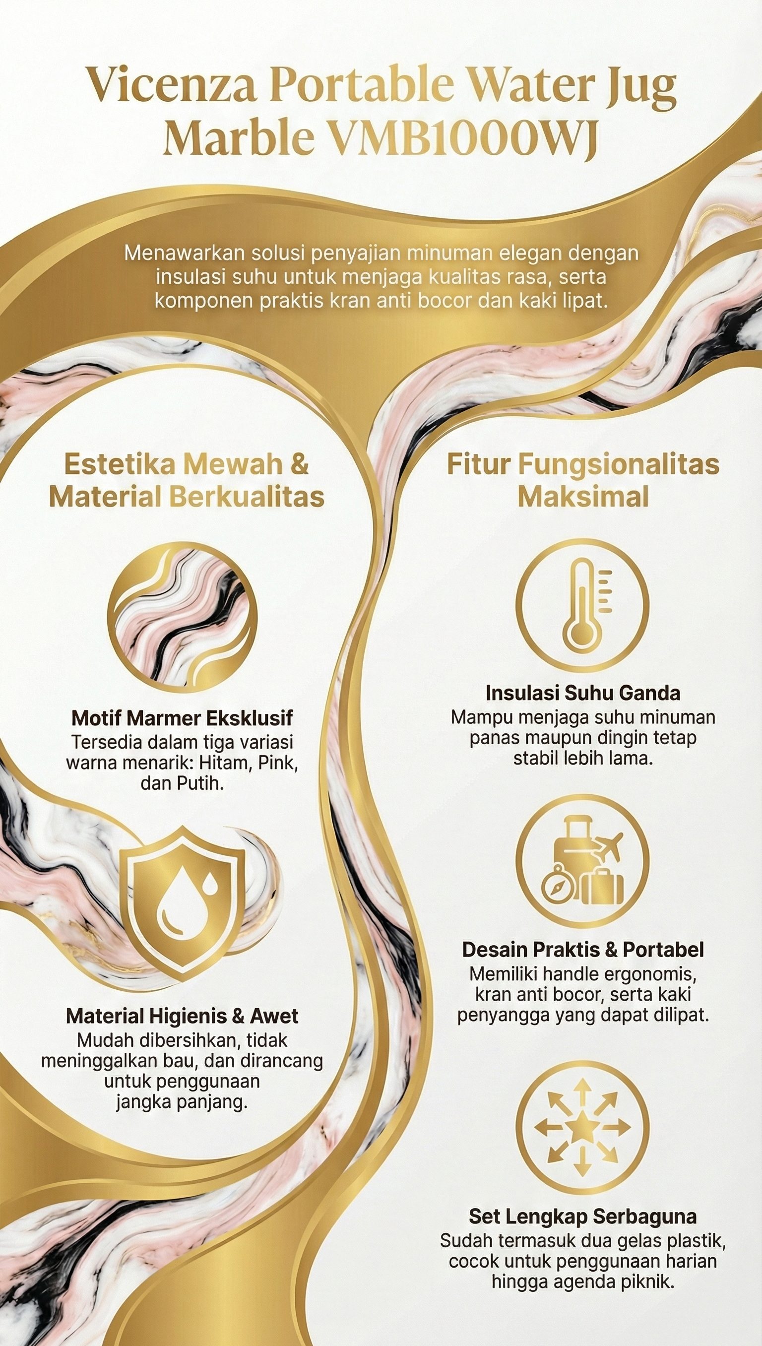 Bisa digunakan untuk kebutuhan sehari-hari, saat mengadakan acara spesial, maupun dibawa dalam agenda piknik dan berlibur bersama orang tercinta. Segera miliki dan nikmati kemudahan juga keindahan dalam menyajikan minuman dengan water jug marmer Vicenza!