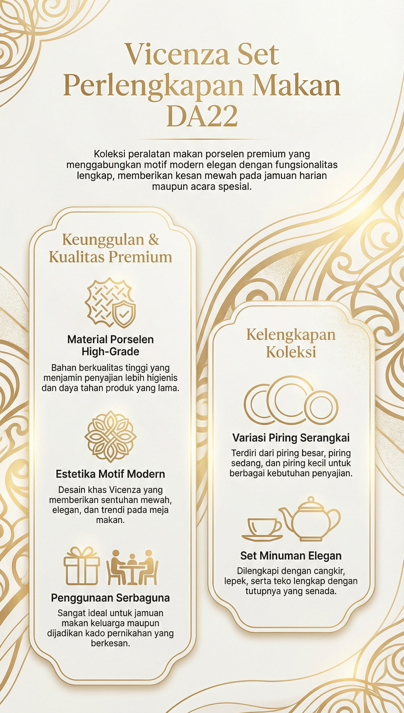 Vicenza Perlengkapan Makan Ayana DA22 hadir dengan motif Ayana modern yang elegan. Dinner set ini terdiri dari 4 piring besar (10,5"), 4 piring sedang (8"), 4 piring kecil (7"), 4 cangkir, 4 lepek, dan 1 teko dengan tutup. Desain modern dan praktis membuatnya cocok untuk penggunaan harian maupun jamuan tamu.