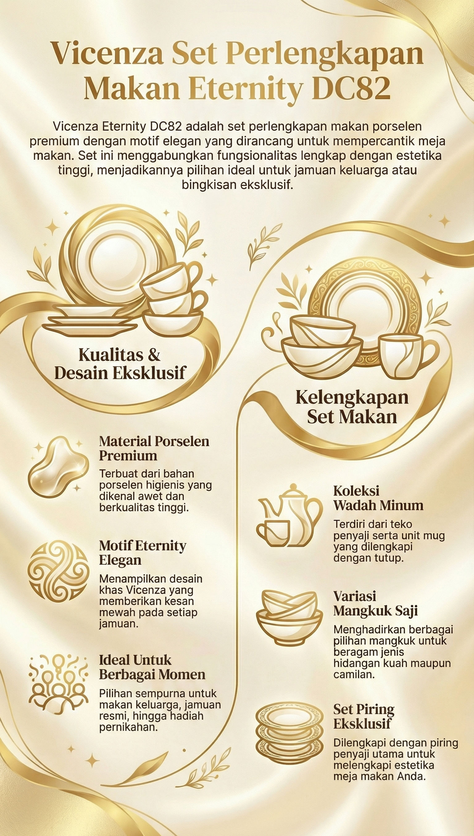 Vicenza Perlengkapan Makan Eternity DC82 adalah set dinner porselen premium bermotif Eternity elegan, dirancang untuk momen kebersamaan keluarga maupun hadiah pernikahan. Satu set terdiri dari 2 mug dengan tutup, 2 piring besar 10,5 inch, serta berbagai mangkuk dengan kapasitas berbeda: 5" (300 ml), 6" (375 ml), 7" (560 ml), dan 9" (1175 ml).