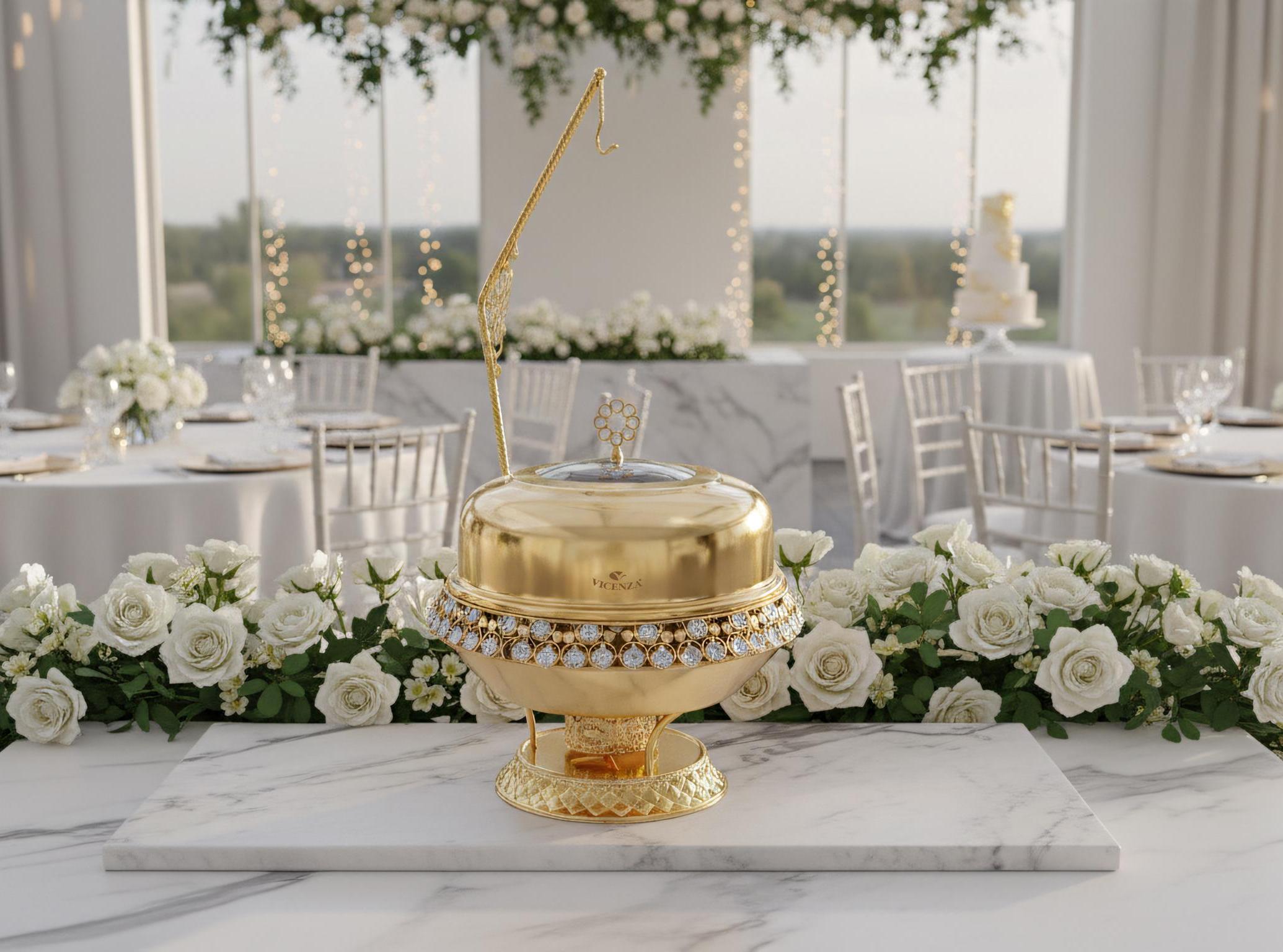 Shera Chafing Dish VCF097 hadir dengan tampilan yang memukau dan menciptakan kesan yang mewah. Didesain dalam balutan warna emas dengan sentuhan ornamen permata yang berkilau. Chafing dish ini terbuat dari bahan stainless steel yang berkualitas sehingga aman digunakan dan mudah dibersihkan.
