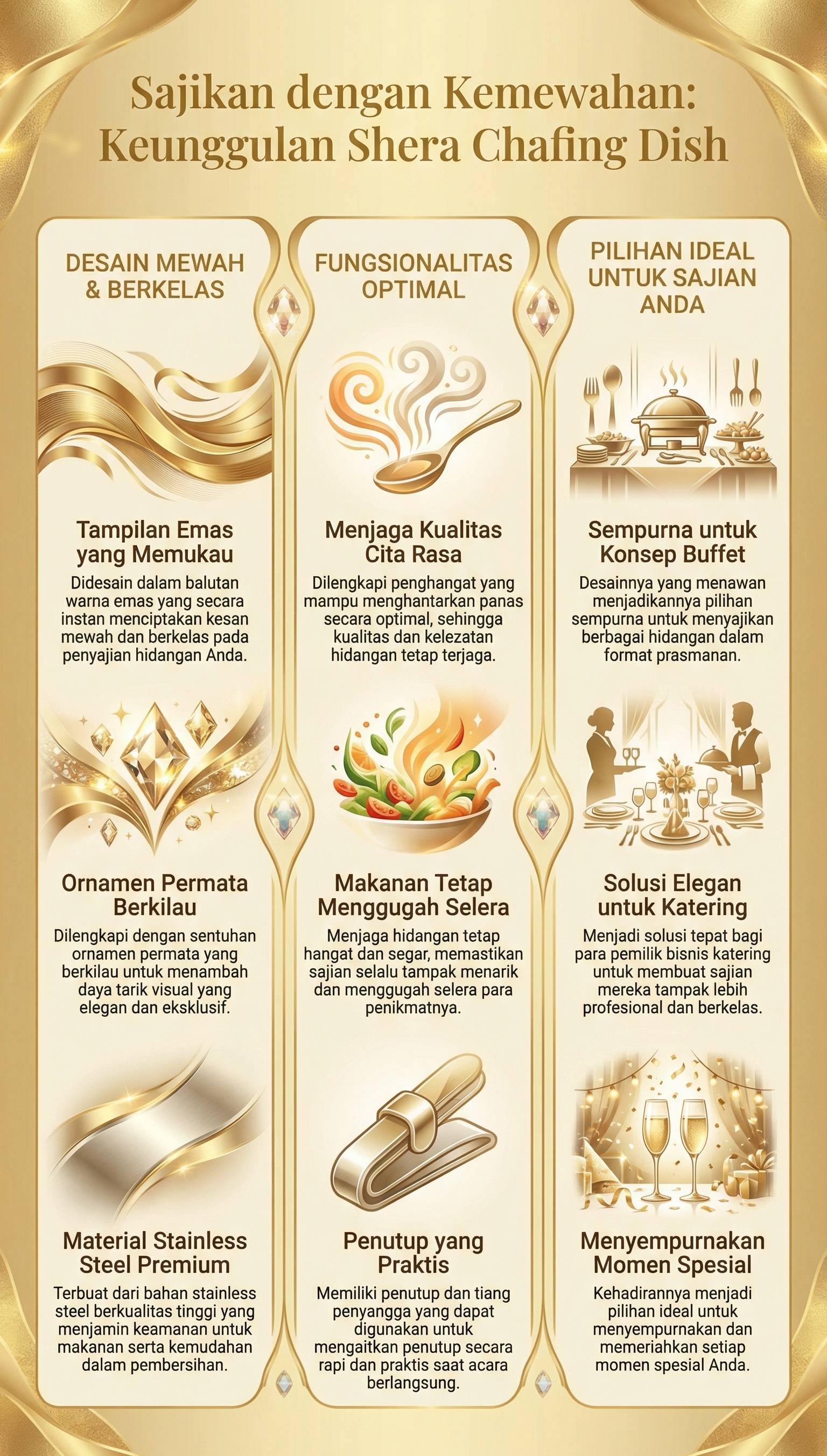 Kehadiran chafing dish ini sangat sempurna untuk menyajikan hidangan dalam konsep buffet. Kapasitas dan desainnya yang menawan membuat produk ini menjadi pilihan ideal untuk menyempurnakan setiap momen spesial. Selain itu, bisa menjadi solusi yang tepat bagi para pemilik katering untuk membuat sajian tampak lebih elegan dan berkelas.