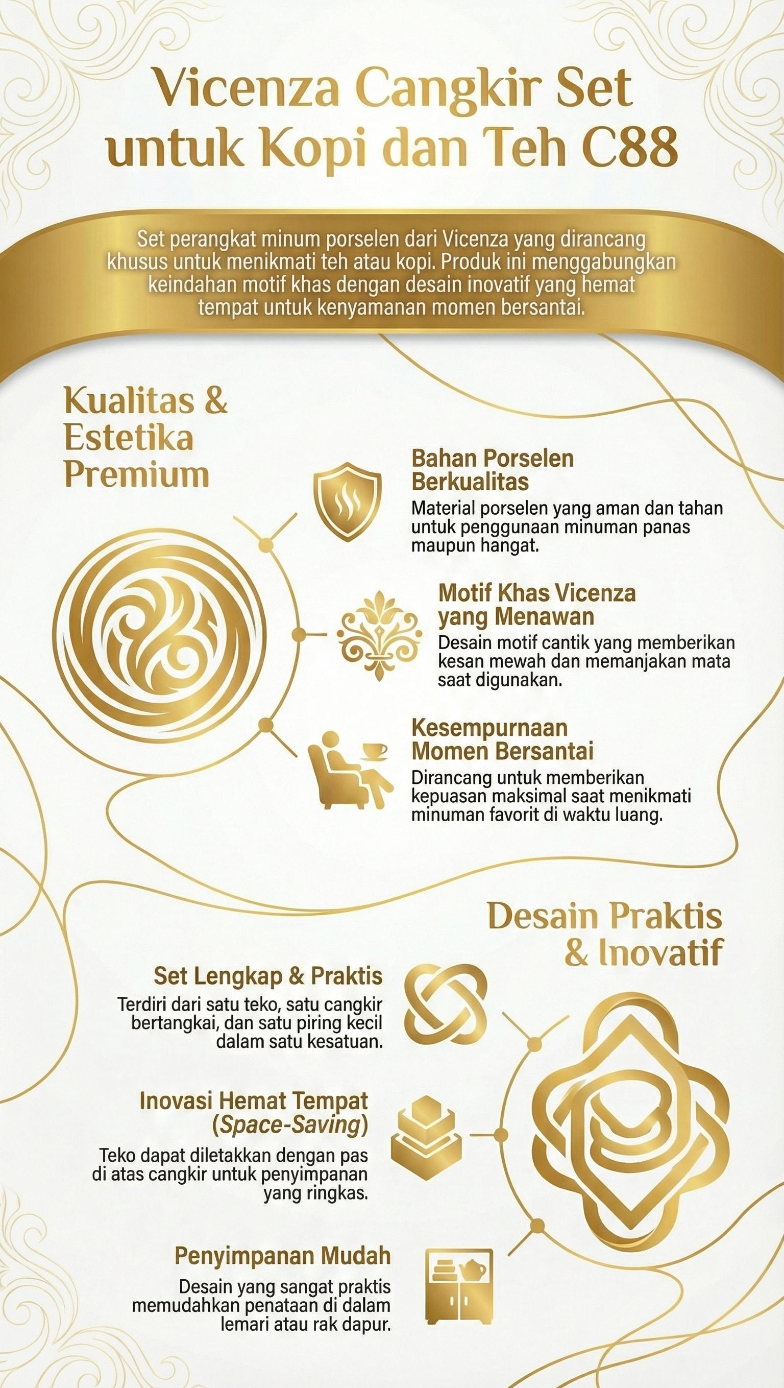 Nikmati secangkir teh atau kopi saat bersantai dengan Perangkat Minum C88 dari Vicenza. Berbahan dasar porselen, set minum ini aman digunakan untuk minuman dalam keadaan panas maupun hangat. Hadir dengan motif cantik khas Vicenza yang menawan dan memanjakan mata. Momen bersantai sambil ditemani minuman favorit kian sempurna dan memuaskan.