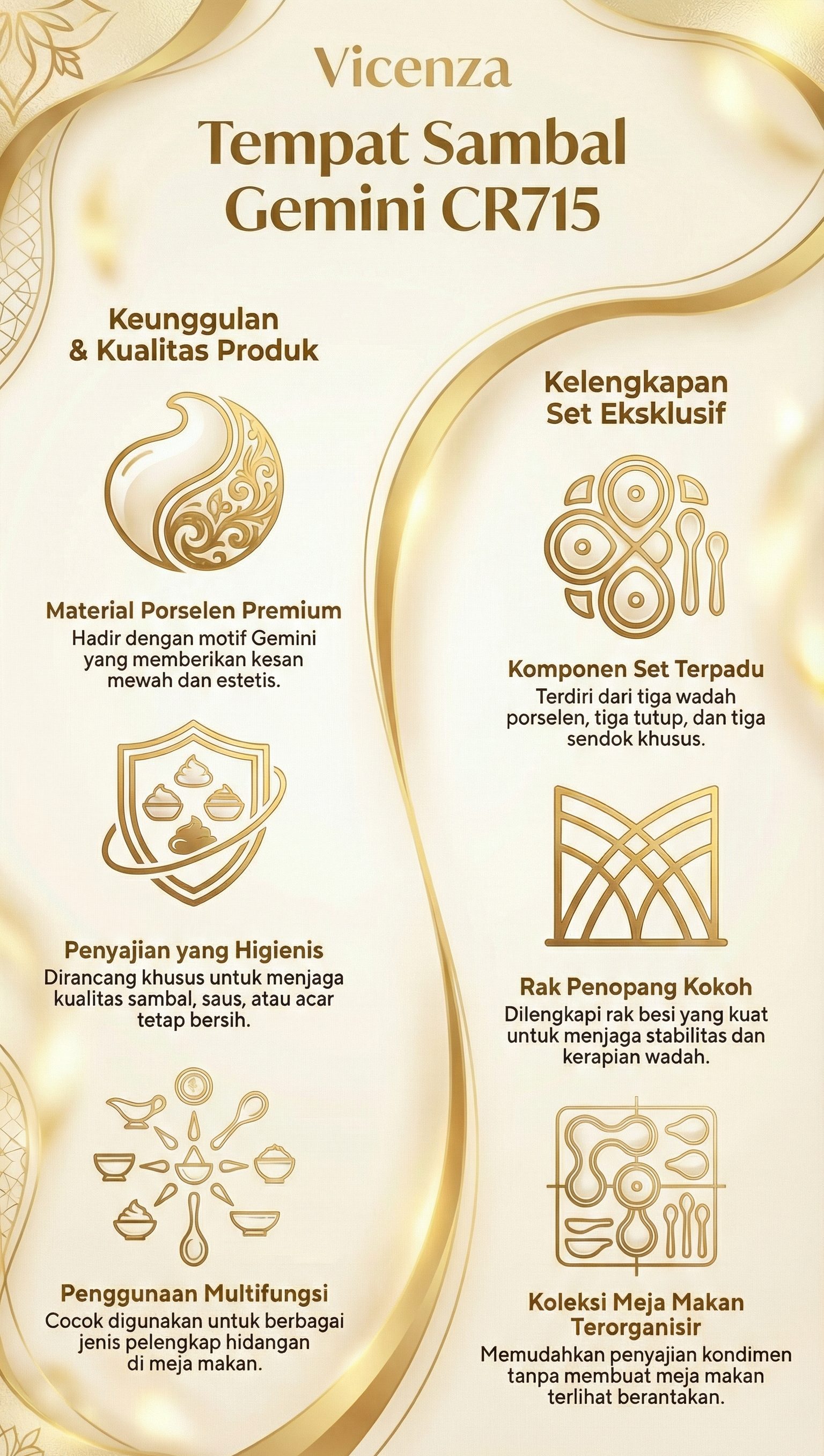 Vicenza Tempat Sambal Motif Gemini CR715 adalah set porselen elegan yang dirancang khusus untuk menyajikan sambal, saus, atau acar dengan rapi dan higienis. Dengan motif Gemini yang mewah, produk ini menghadirkan sentuhan estetis sekaligus fungsional pada meja makan Anda. Satu set terdiri dari 3 wadah porselen, masing-masing dilengkapi dengan tutup dan sendok, serta ditopang oleh rak besi yang kokoh. Wadah berukuran ideal ini menjaga kondimen tetap higienis, memudahkan penyajian, dan membuat meja makan lebih tertata.