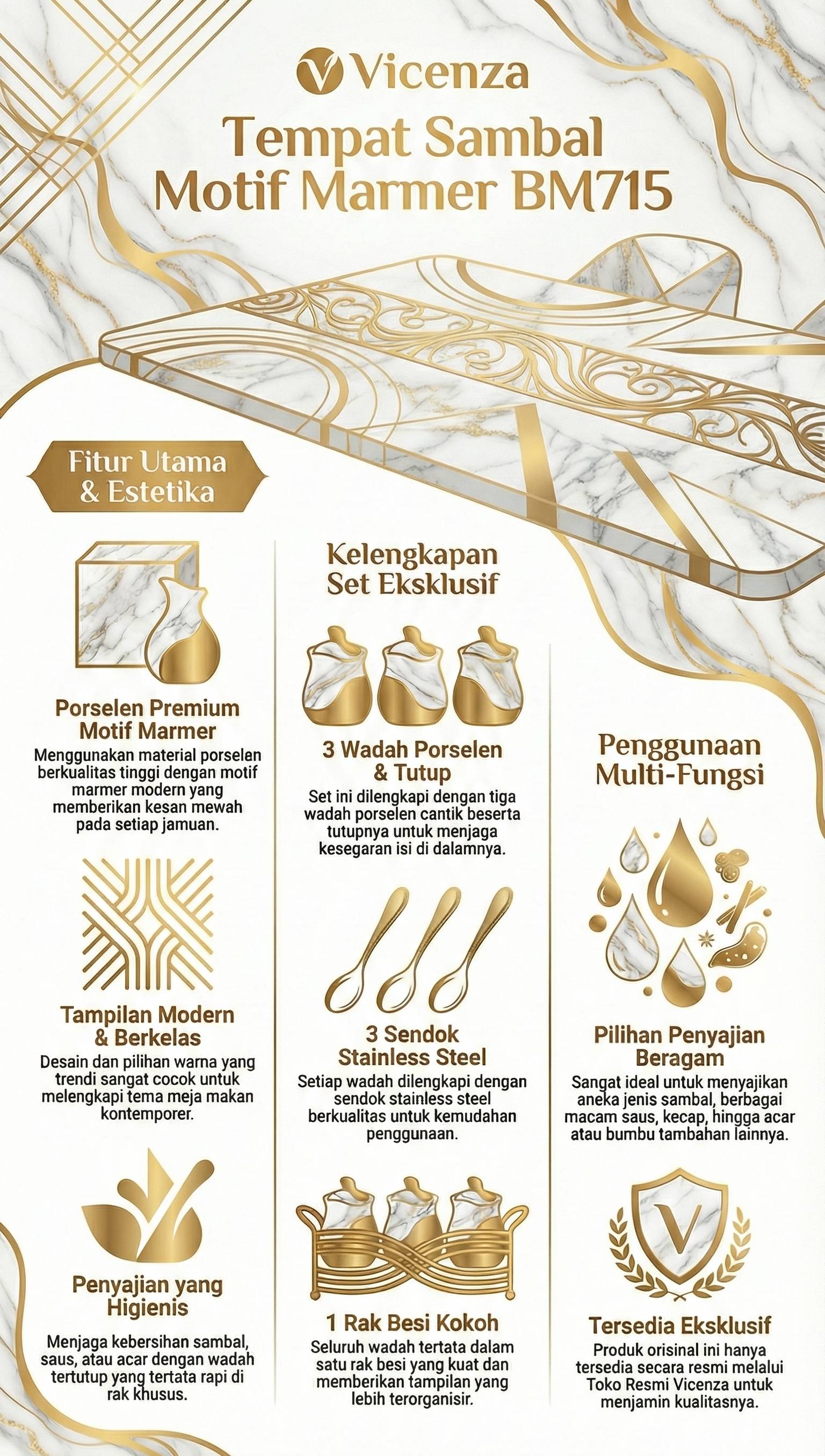 Vicenza Tempat Sambal Pink Motif Marmer BM715 adalah set porselen mewah yang dirancang untuk menyajikan sambal, saus, kecap, atau acar dengan rapi dan higienis. Dihiasi motif marmer modern bernuansa pink, produk ini menambah keindahan meja makan sekaligus memudahkan penyajian kondimen. Satu set terdiri dari 3 wadah porselen lengkap dengan tutup, sendok stainless steel, serta rak besi kokoh yang menambah kesan elegan. Dengan kapasitas yang pas, BM715 praktis digunakan baik untuk santapan keluarga maupun acara spesial.