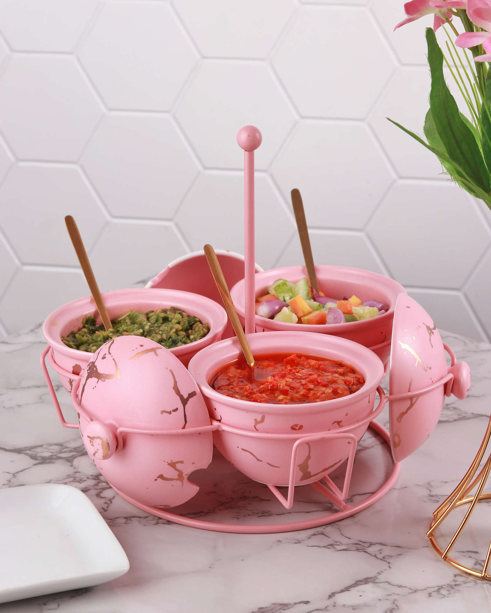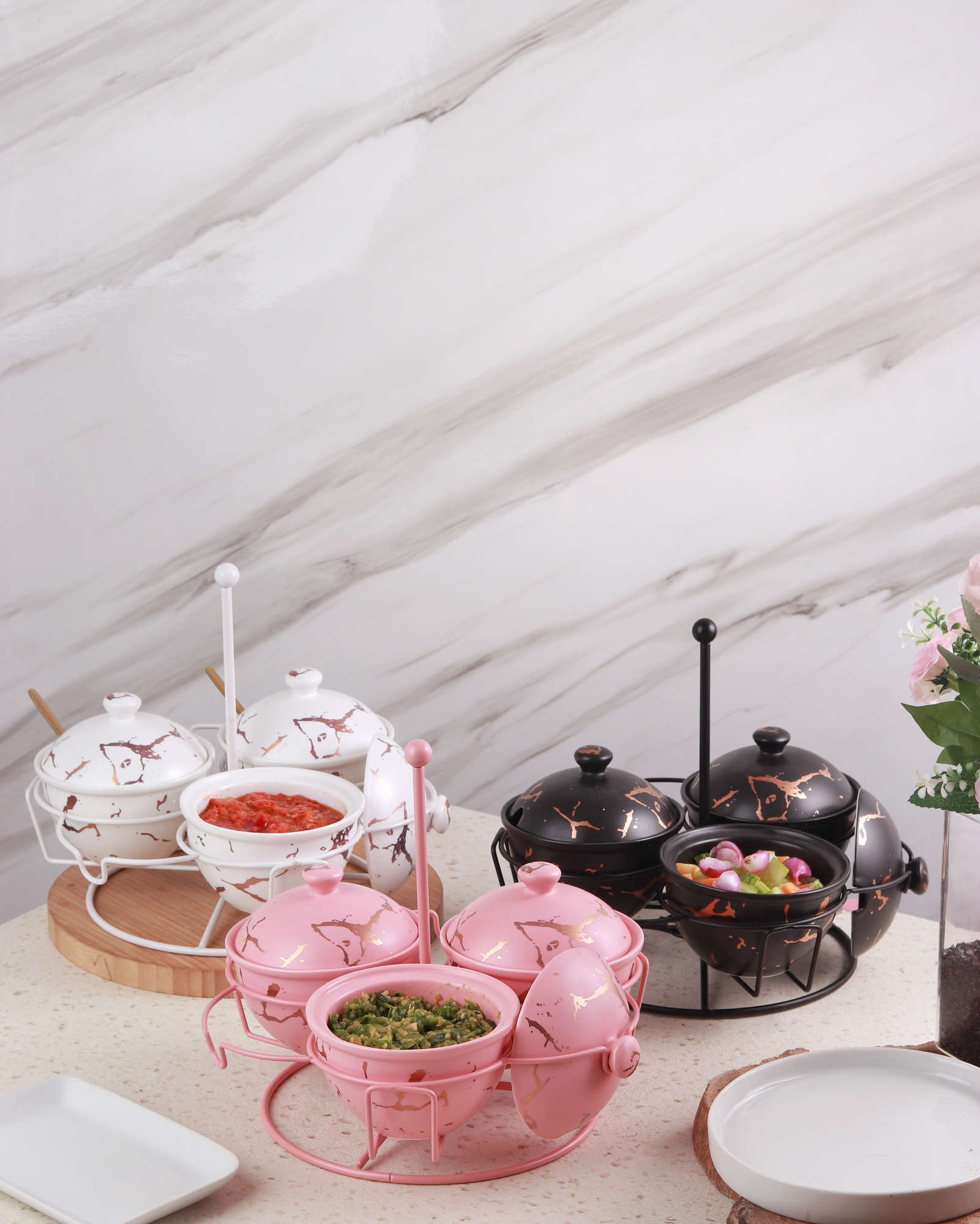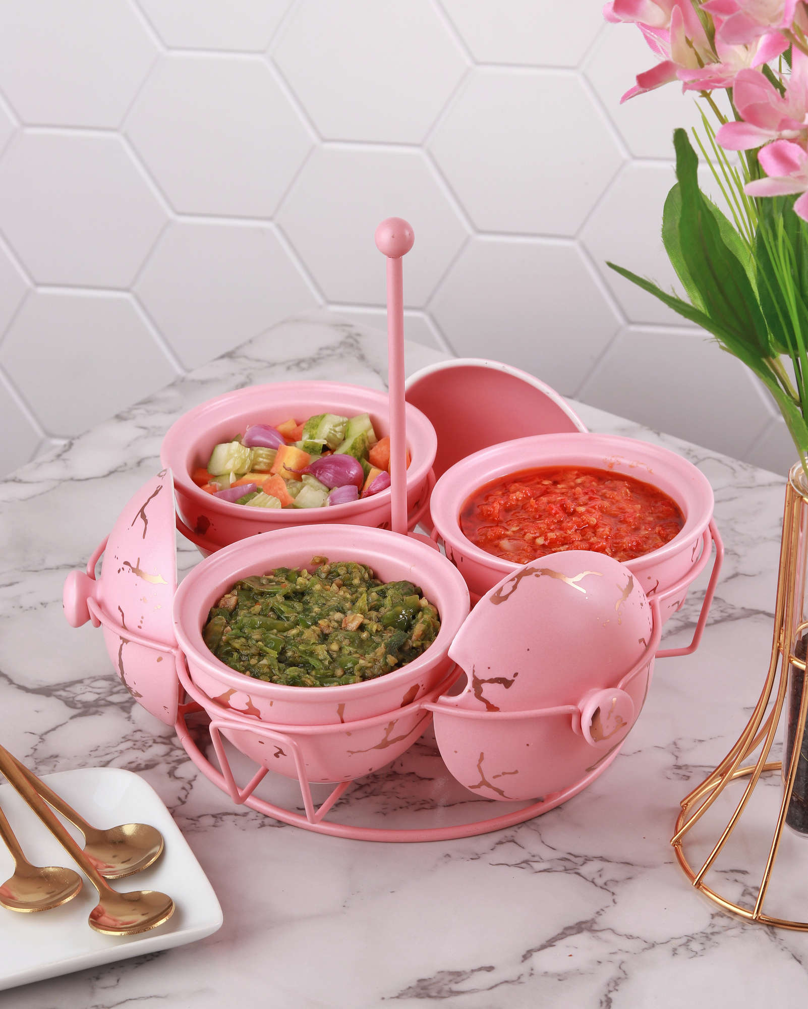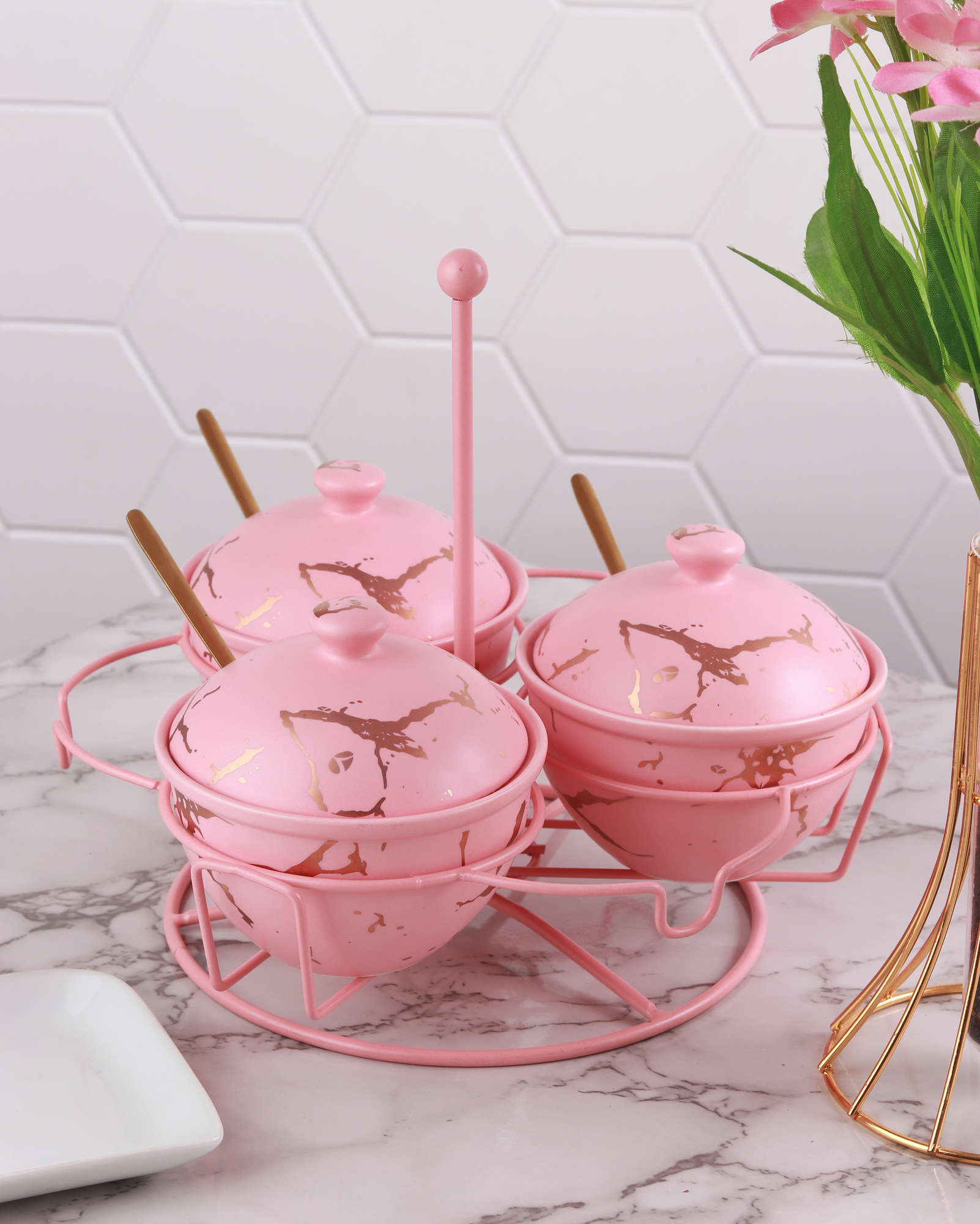 Vicenza Tempat Sambal Pink Motif Marmer BM715 adalah set porselen mewah yang dirancang untuk menyajikan sambal, saus, kecap, atau acar dengan rapi dan higienis. Dihiasi motif marmer modern bernuansa pink, produk ini menambah keindahan meja makan sekaligus memudahkan penyajian kondimen. Satu set terdiri dari 3 wadah porselen lengkap dengan tutup, sendok stainless steel, serta rak besi kokoh yang menambah kesan elegan. Dengan kapasitas yang pas, BM715 praktis digunakan baik untuk santapan keluarga maupun acara spesial.