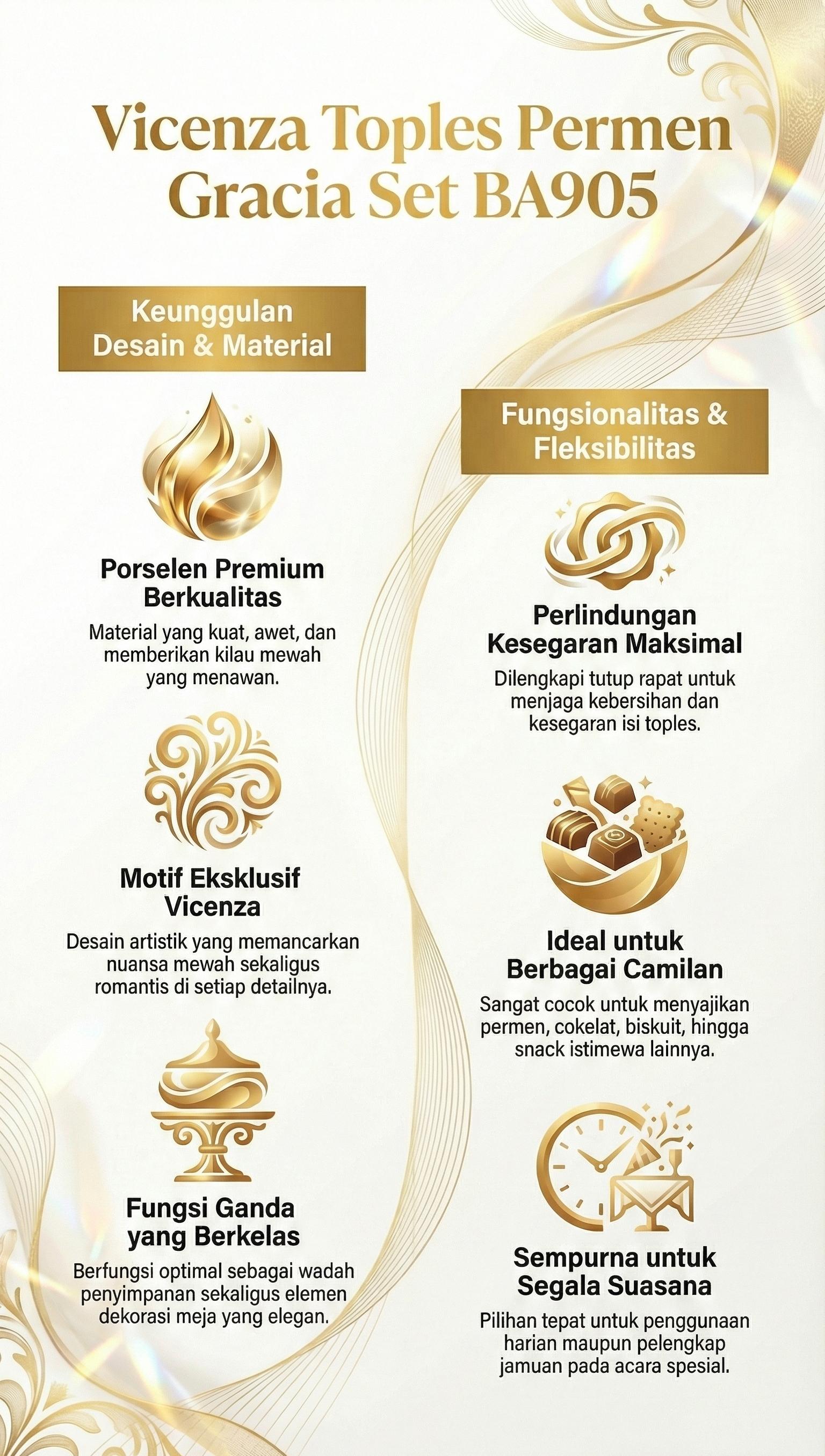 Dengan perpaduan fungsi dan estetika, Vicenza Toples Permen Gracia Set 3pcs Ayana BA905 mempercantik penyajian camilan Anda sekaligus menjadi koleksi dekoratif eksklusif.