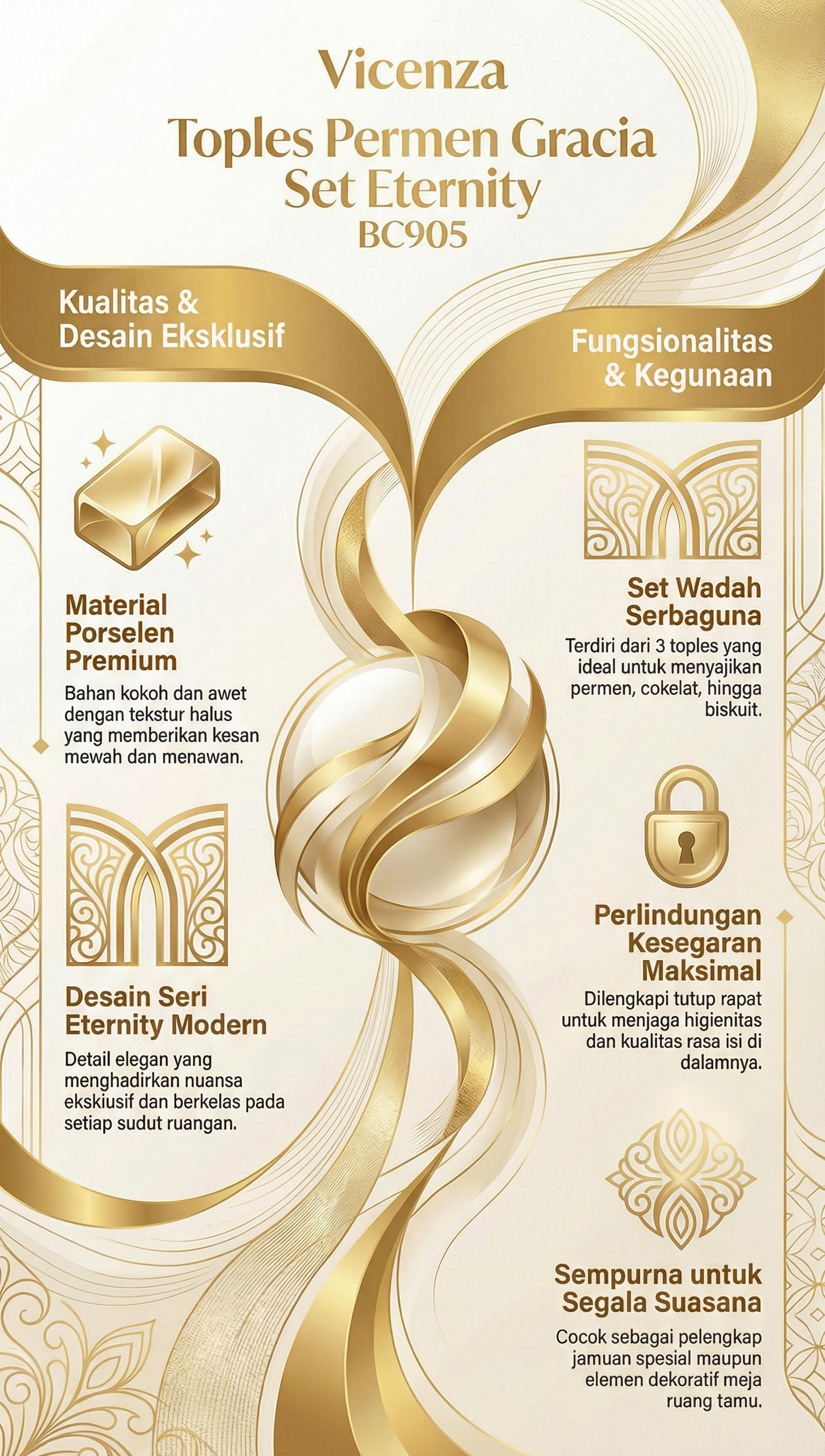 Dengan kualitas tinggi dan desain mewah, Vicenza Toples Permen Gracia Set 3pcs Eternity BC905 siap memperindah penyajian camilan Anda sekaligus menjadi koleksi dekoratif yang bernilai.