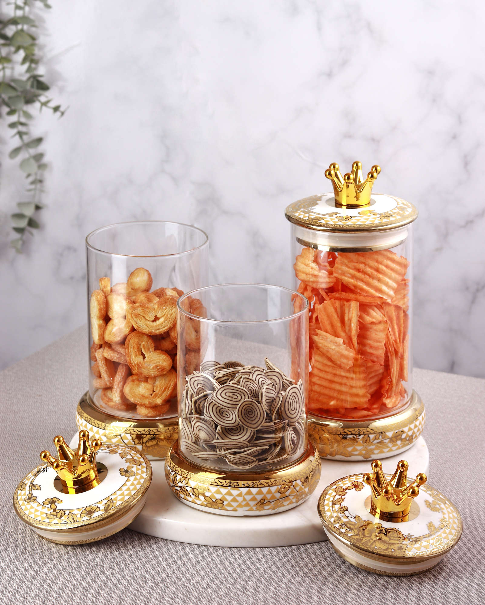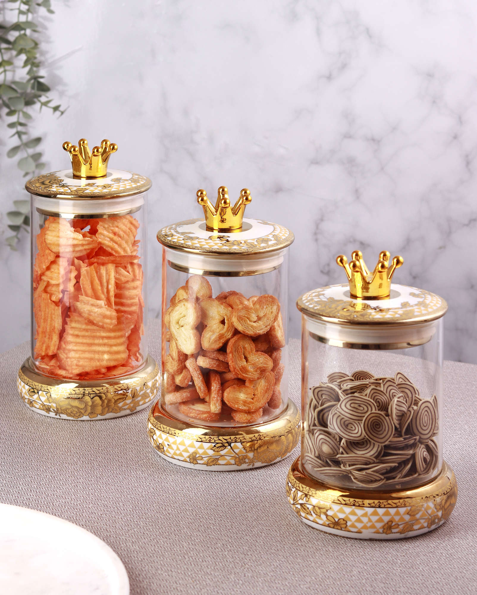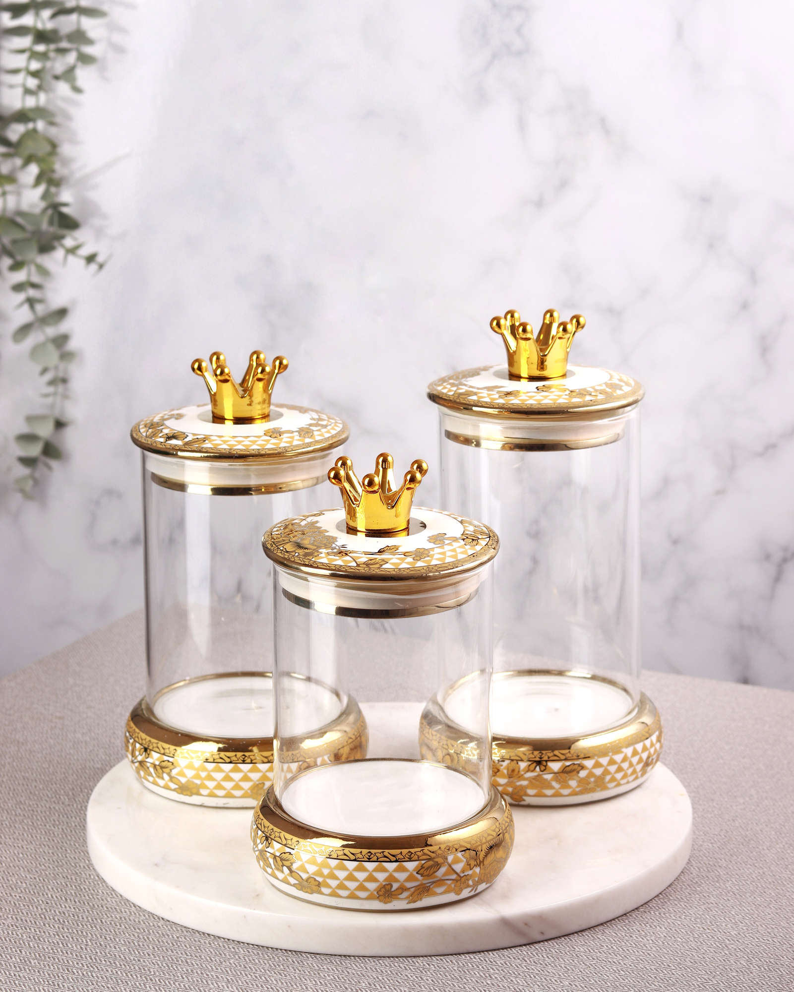 Satu set toples terdiri dari 3 ukuran (S, M, L) yang ideal untuk variasi manisan. Motif Gemini yang klasik dan menawan, berpadu dengan knob berbentuk mahkota yang elegan, menciptakan nuansa mewah dan berkelas di rumah Anda.