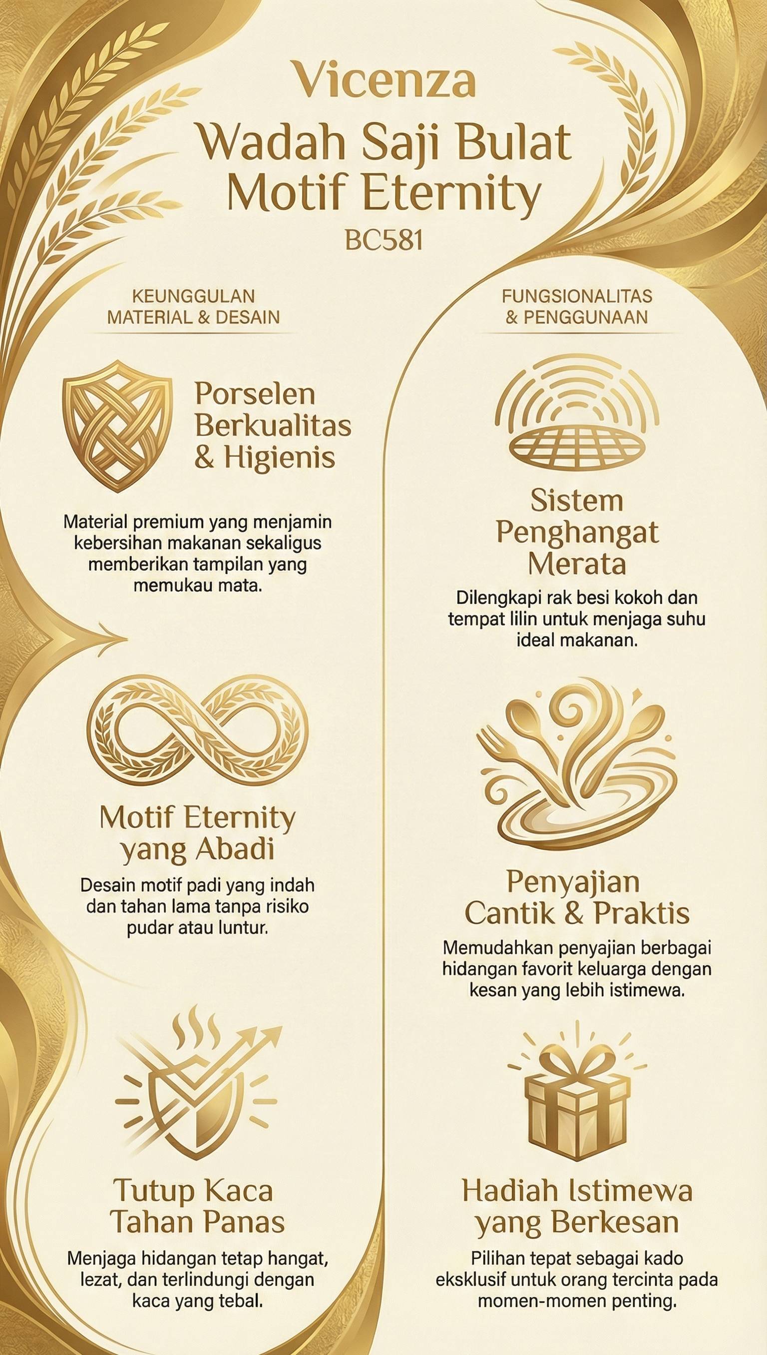 Perkenalkan keanggunan terbaru dari koleksi Vicenza yang akan menyempurnakan momen bersantap Anda, Vicenza Wadah Saji Bulat tipe BC581 dengan motif Eternity yang eksklusif. Terbuat dari porselen berkualitas tinggi yang tidak hanya memukau mata tetapi juga menjamin kehigienisan makanan Anda. Tutup kaca tebal dan tahan panas menjaga hidangan tetap hangat dan lezat. Dengan rak besi yang kokoh dan penyangga elegan, dilengkapi tempat lilin untuk menghangatkan makanan Anda secara merata. Ukuran wadah dengan diameter 23 CM dan tinggi 14 CM ini memiliki volume hingga 3500 ML, sempurna untuk berbagai jenis hidangan favorit keluarga Anda. Motif Padi yang indah akan bertahan lama tanpa pudar atau luntur, menambah sentuhan kemewahan pada setiap acara makan Anda. Produk ini juga aman digunakan, mudah dibersihkan, dan tidak berbau.