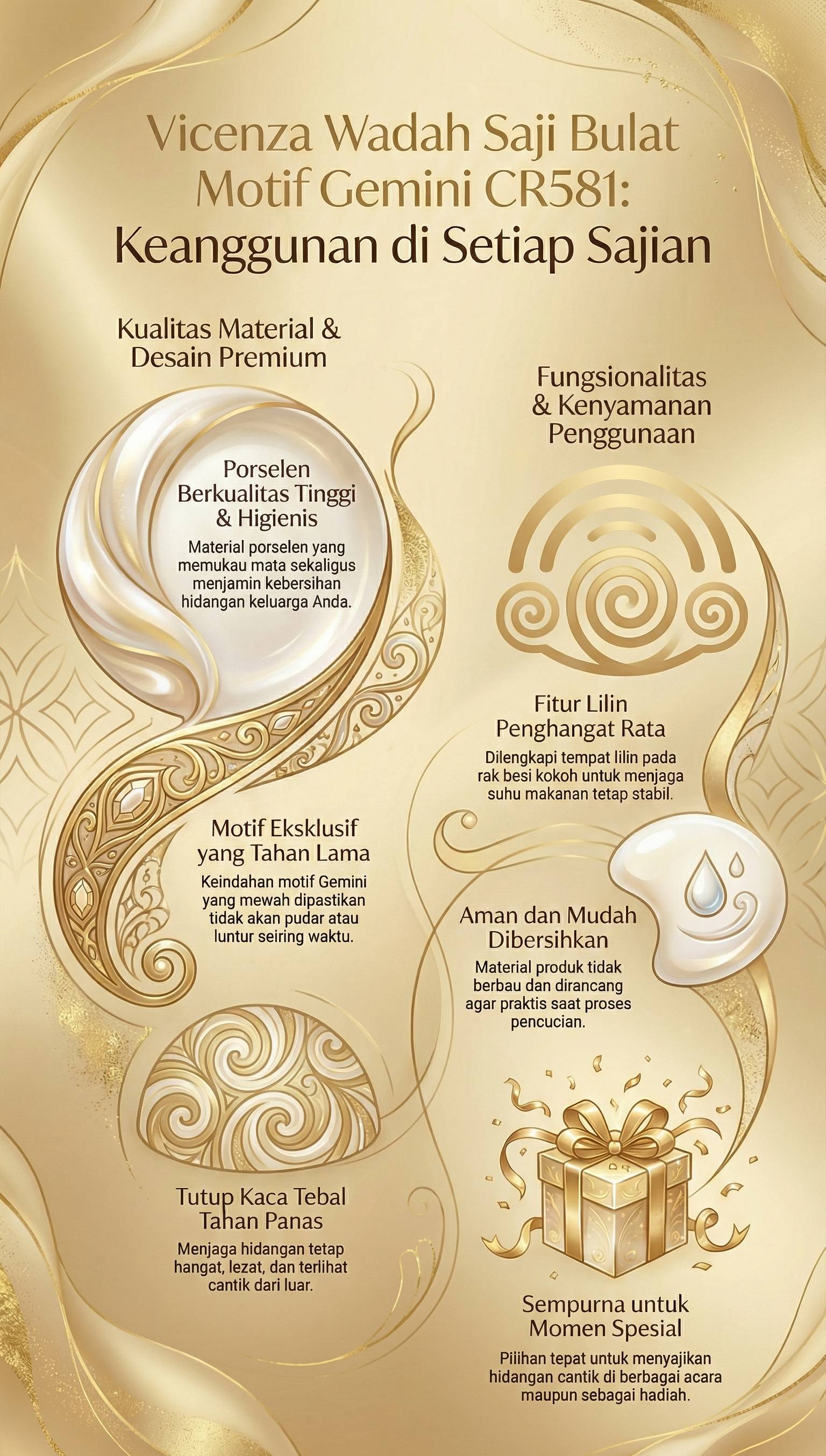 Perkenalkan keanggunan terbaru dari koleksi Vicenza yang akan menyempurnakan momen bersantap Anda, Vicenza Wadah Saji Bulat CR581 dengan motif Gemini yang eksklusif. Terbuat dari porselen berkualitas tinggi yang tidak hanya memukau mata tetapi juga menjamin kehigienisan makanan Anda. Tutup kaca tebal dan tahan panas menjaga hidangan tetap hangat dan lezat. Dengan rak besi yang kokoh dan penyangga elegan, dilengkapi tempat lilin untuk menghangatkan makanan Anda secara merata. Ukuran wadah dengan diameter 23 CM dan tinggi 14 CM ini memiliki volume hingga 3500 ML, sempurna untuk berbagai jenis hidangan favorit keluarga Anda. Motif Padi yang indah akan bertahan lama tanpa pudar atau luntur, menambah sentuhan kemewahan pada setiap acara makan Anda. Produk ini juga aman digunakan, mudah dibersihkan, dan tidak berbau.