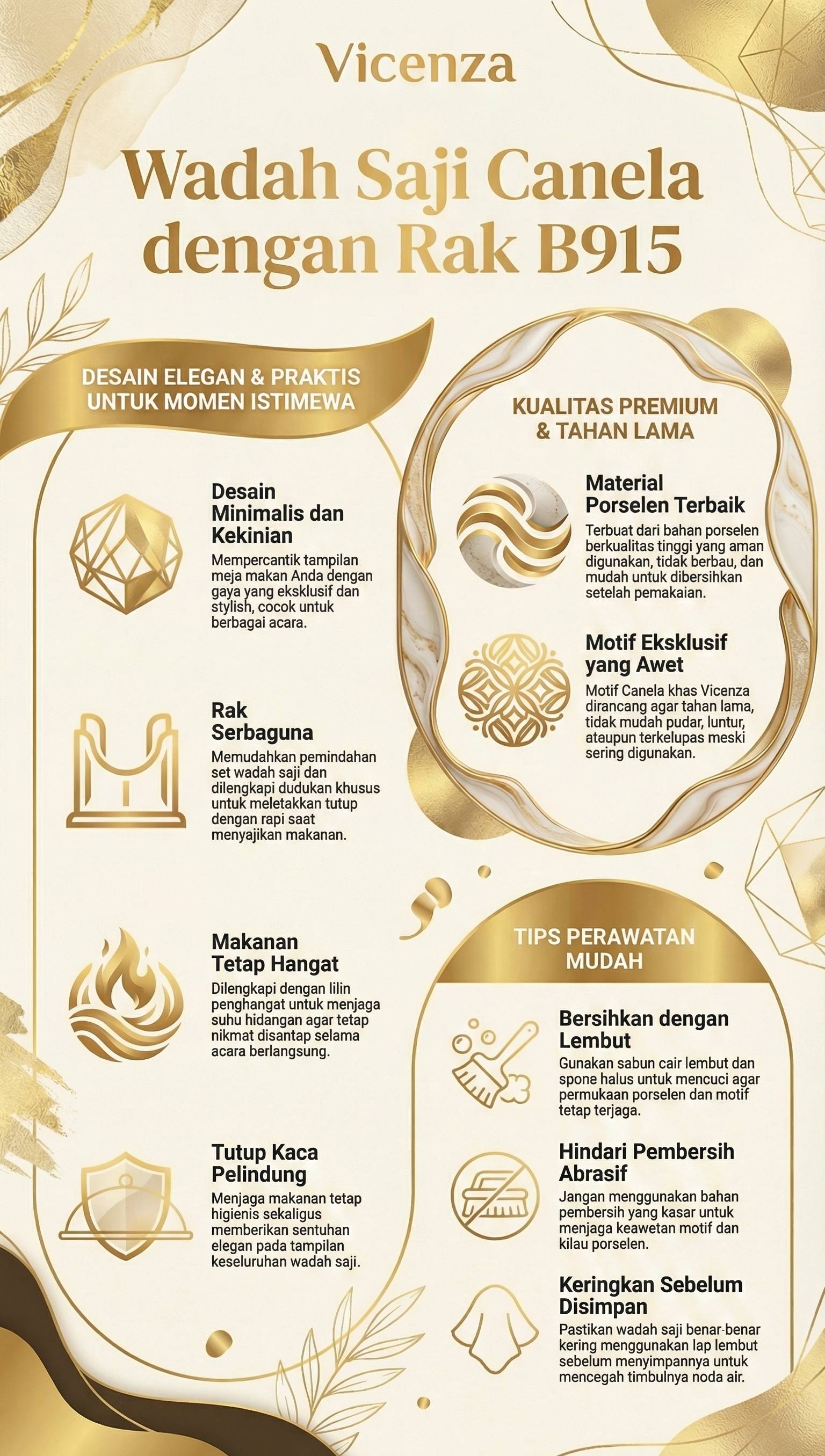 Bunda, hadirkan kemewahan dan kepraktisan dalam setiap acara spesial keluarga dengan Vicenza Wadah Saji Canela dengan Rak Padi B915! Set wadah saji ini dirancang khusus untuk menyajikan aneka hidangan sekaligus, mulai dari lauk, sayur, hingga makanan lainnya, menjadikannya sempurna untuk acara keluarga, arisan, atau perayaan lainnya. Desainnya yang minimalis dan kekinian akan mempercantik tampilan meja makan Anda.