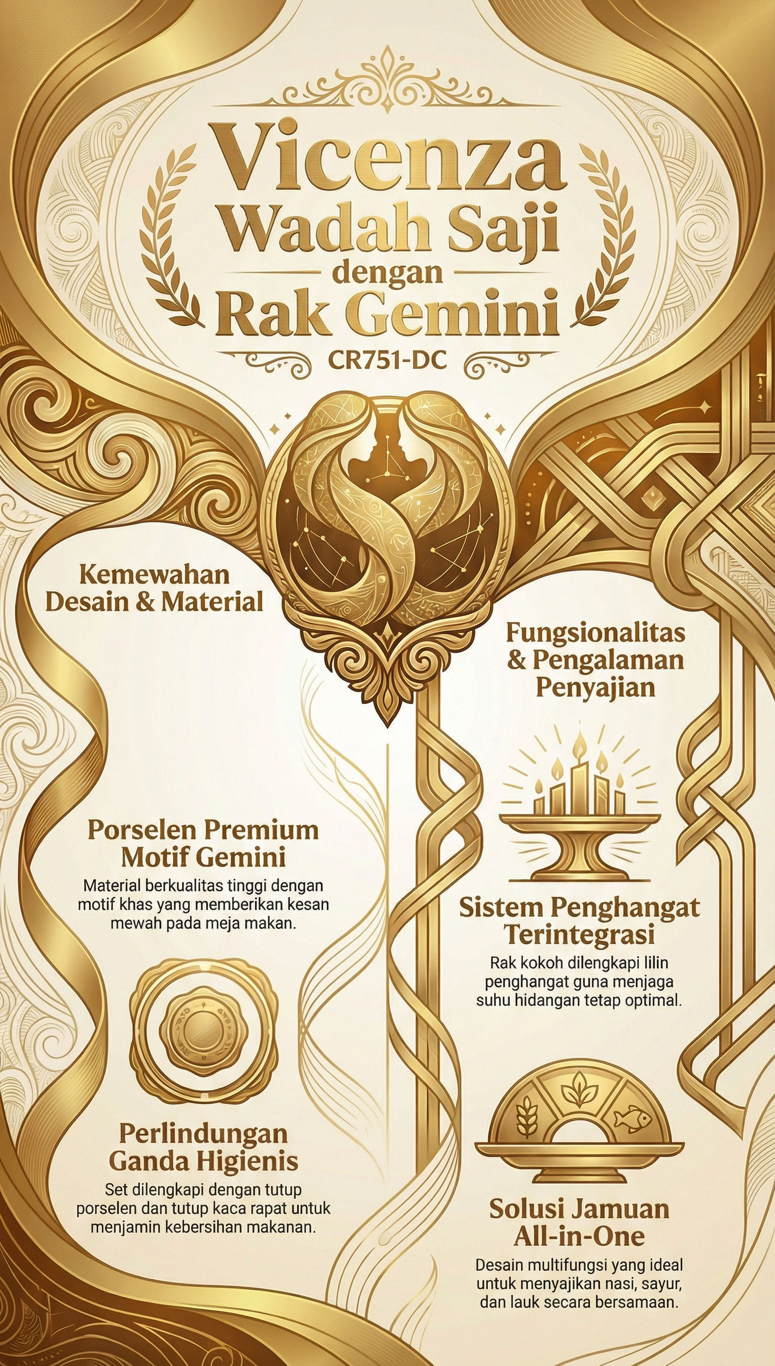 Vicenza Alat Saji dengan Rak Motif Gemini CR751-DC adalah set porselen elegan yang dirancang untuk menyajikan hidangan dengan praktis dan mewah. Dengan motif Gemini khas Vicenza, produk ini terdiri dari 3 wadah porselen lengkap dengan 3 tutup porselen dan 3 tutup kaca rapat yang menjaga makanan tetap higienis. Rak kokoh dilengkapi lilin penghangat yang membuat hidangan tetap hangat hingga saat disantap. Cocok untuk menyajikan nasi, sayur, dan lauk sekaligus, produk ini menjadi solusi ideal untuk santapan keluarga maupun acara spesial. Terbuat dari porselen premium berkualitas, CR751-DC tahan lama, mudah dibersihkan, sekaligus memperindah tampilan meja makan.